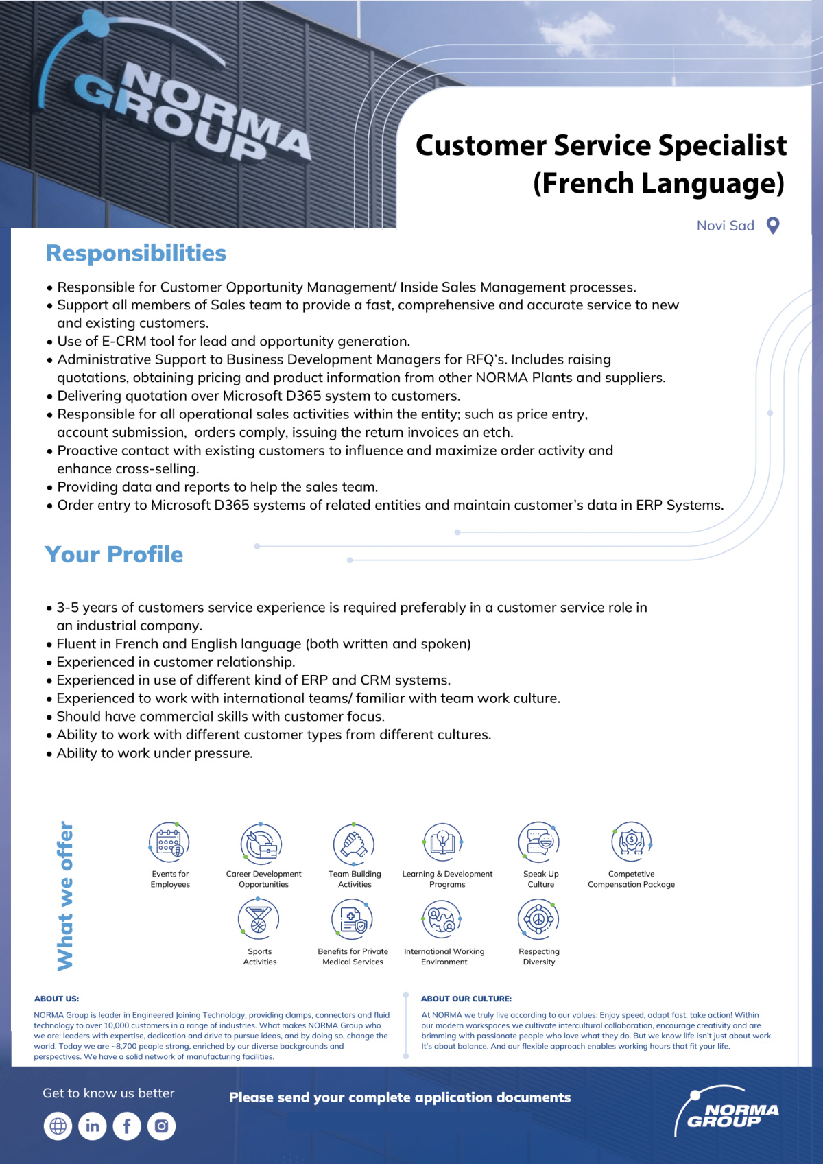 NORMA Grupa je lider na svetskom tržištu u oblasti Tehnologije konstruisanih spona i spojnica. Nudi više od 35.000 proizvoda visokog kvaliteta i rešenja za gotovo 10.000 aktivnih korisnika širom sveta. Kompanija proizvodi i prodaje široku paletu inovativnih rešenja u kategorijama spona, spojnica i fluid programa za različite klijente u više od 80 zemalja. NORMA Srbija razvija i proizvodi najinovativnije, na plastici zasnovane, komponente i sisteme iz oblasti Tehnologija spajanja za automobilsku…