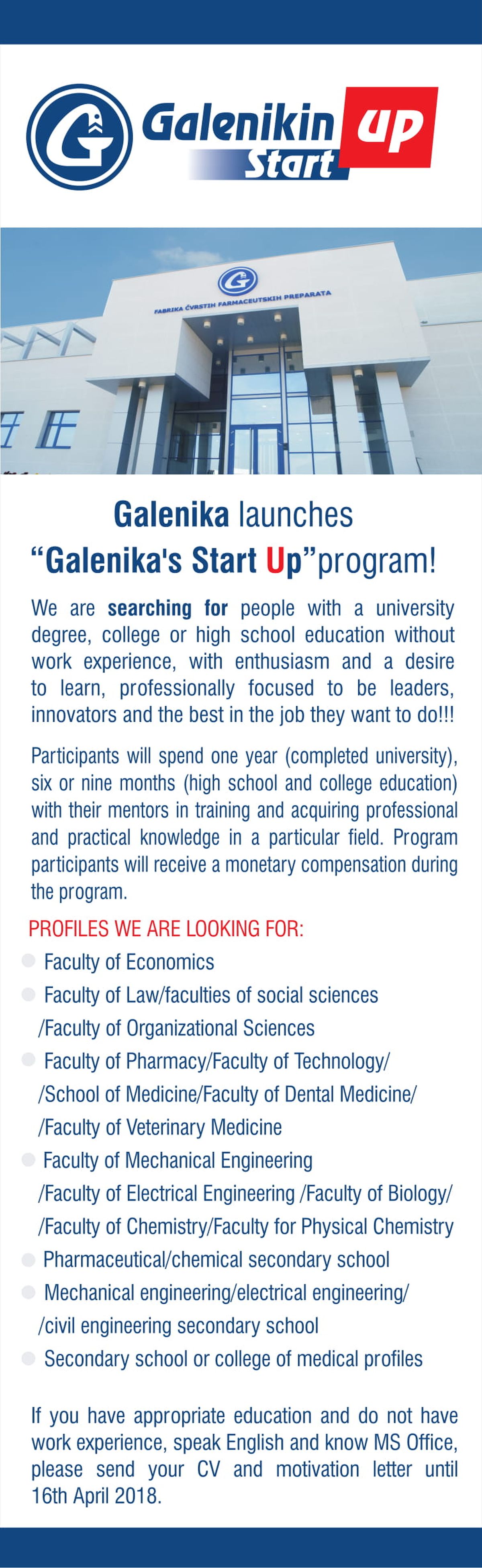 Budućnost pripada onima koji veruju u lepotu svojih snova Stvaranje dodatne vrednosti za korisnike, stručnu javnost, zaposlene i akcionare postavljanjem najviših standarda industrije i primenom višedecenijskog iskustva u pružanju inovativnih rešenja u farmaceutskom poslovanju je naša misija. Farmaceutska kompanija Galenika osnovana je 1945. godine. Danas je jedan od vodećih regionalnih proizvođača generičkih lekova, dijetetskih suplemenata, medicinskih sredstava i proizvoda za svakodnevnu…