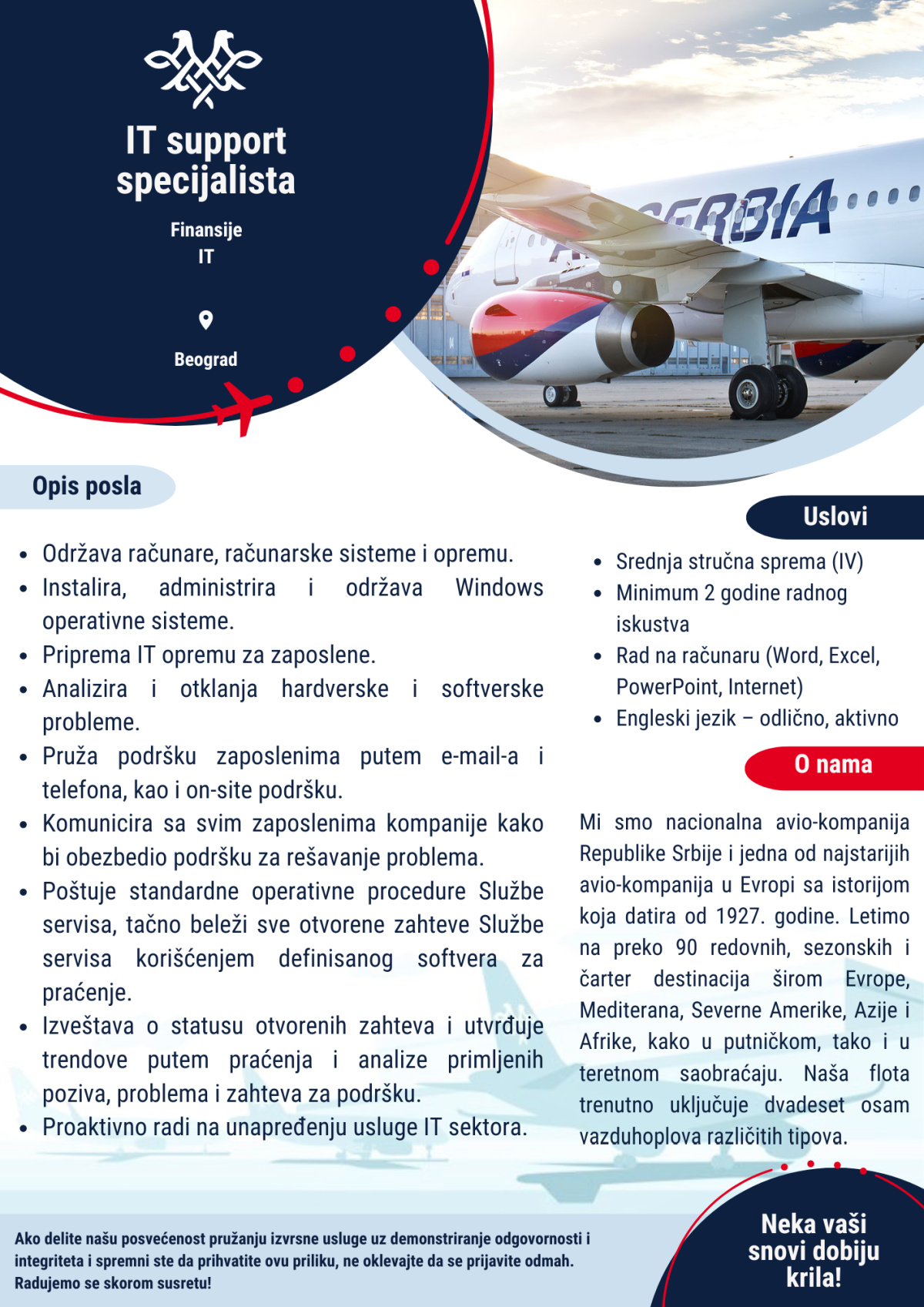 Ukrcajte se, polećemo! Er Srbija je ponosni naslednik prve nacionalne avio-kompanije Aeroput, osnovane 17. juna 1927. godine u Beogradu. Kompanija se nalazi na osmom mestu na listi najstarijih avio-kompanija u svetu koje i dalje posluju. Pod današnjim imenom poslujemo od 26. oktobra 2013. godine. Srpska nacionalna avio-kompanija leti do više od 80 destinacija širom Evrope, Mediterana, Severne Amerike i Azije, i to u putničkom i teretnom saobraćaju. U saradnji sa partnerskim avio-kompanijama, u…