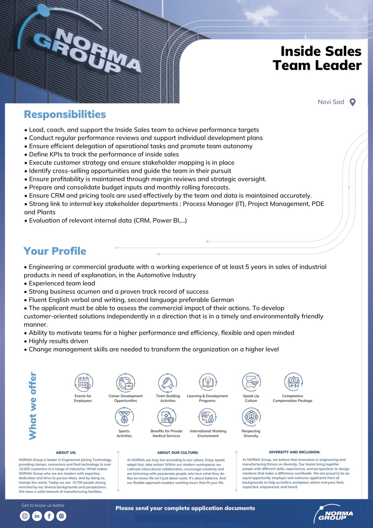NORMA Grupa je lider na svetskom tržištu u oblasti Tehnologije konstruisanih spona i spojnica. Nudi više od 35.000 proizvoda visokog kvaliteta i rešenja za gotovo 10.000 aktivnih korisnika širom sveta. Kompanija proizvodi i prodaje široku paletu inovativnih rešenja u kategorijama spona, spojnica i fluid programa za različite klijente u više od 80 zemalja. NORMA Srbija razvija i proizvodi najinovativnije, na plastici zasnovane, komponente i sisteme iz oblasti Tehnologija spajanja za automobilsku…