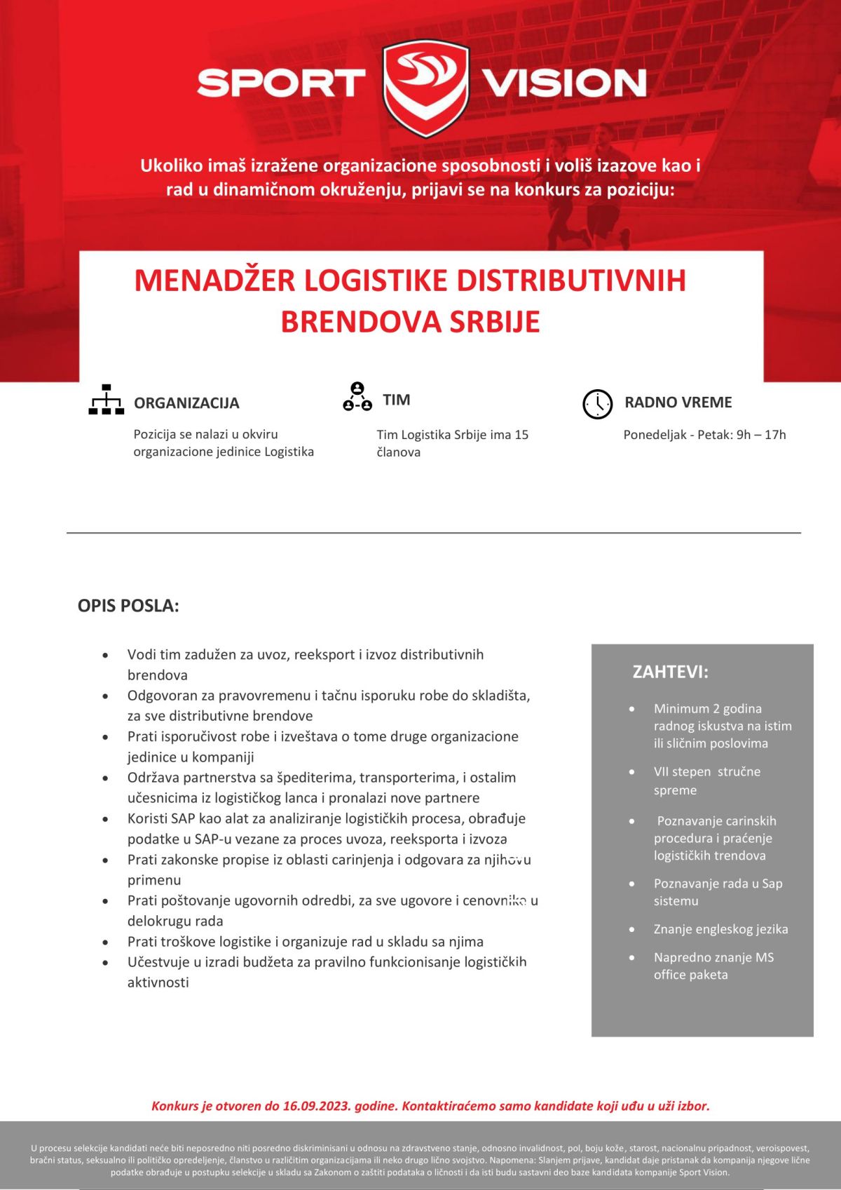 KO SMO MI? SPORT VISION je lider u prodaji sportske obuće, odeće i opreme na Balkanu. Više od 20 godina poslujemo u Srbiji kao moderna kompanija koju odlikuju fleksibilnost, profesionalizam i dinamična strategija razvoja. Naš tim čini više od 6.000 zaposlenih u 13 zemalja − Srbija, Bosna i Hercegovina, Hrvatska, Slovenija, Crna Gora, Severna Makedonija, Albanija, Rumunija, Bugarska, Grčka, Češka, Slovačka i Mađarska, a sedište kompanije nalazi se u Beogradu. Naša maloprodajna mreža broji više…