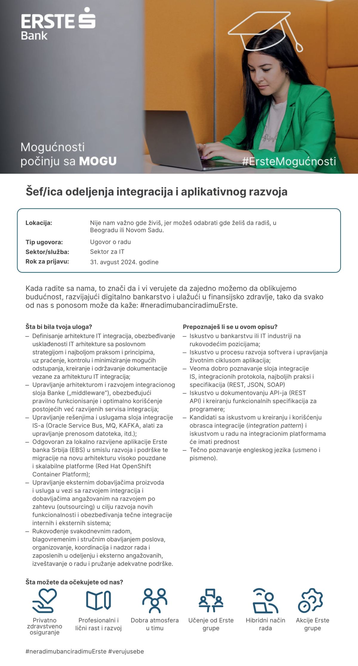 Mi smo ERSTE, gde Mogućnosti počinju sa MOGU Zamisli sebe u svetu mogućnosti uz ljude koji te podržavaju, inspirišu i gde možeš da da iskažeš svoju jedinstvenost kreirajući posebnu vrednost za sve naše klijente. To je ERSTE. Mi verujemo u radno okruženje u kojem se neguje zajedništvo, sloboda da stvaramo i gde se slave uspesi. Otvoreni smo prema novim idejama, jer izazove vidimo kao priliku za učenje i razvoj. Kada si deo našeg tima onda uvek imaš nekoga koga možeš da pitaš kako i zašto.…