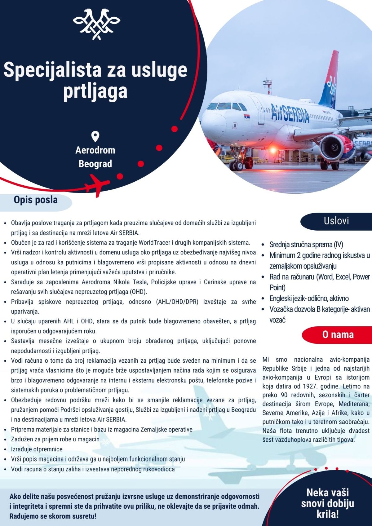 Ukrcajte se, polećemo! Er Srbija je ponosni naslednik prve nacionalne avio-kompanije Aeroput, osnovane 17. juna 1927. godine u Beogradu. Kompanija se nalazi na osmom mestu na listi najstarijih avio-kompanija u svetu koje i dalje posluju. Pod današnjim imenom poslujemo od 26. oktobra 2013. godine. Srpska nacionalna avio-kompanija leti do više od 80 destinacija širom Evrope, Mediterana, Severne Amerike i Azije, i to u putničkom i teretnom saobraćaju. U saradnji sa partnerskim avio-kompanijama, u…