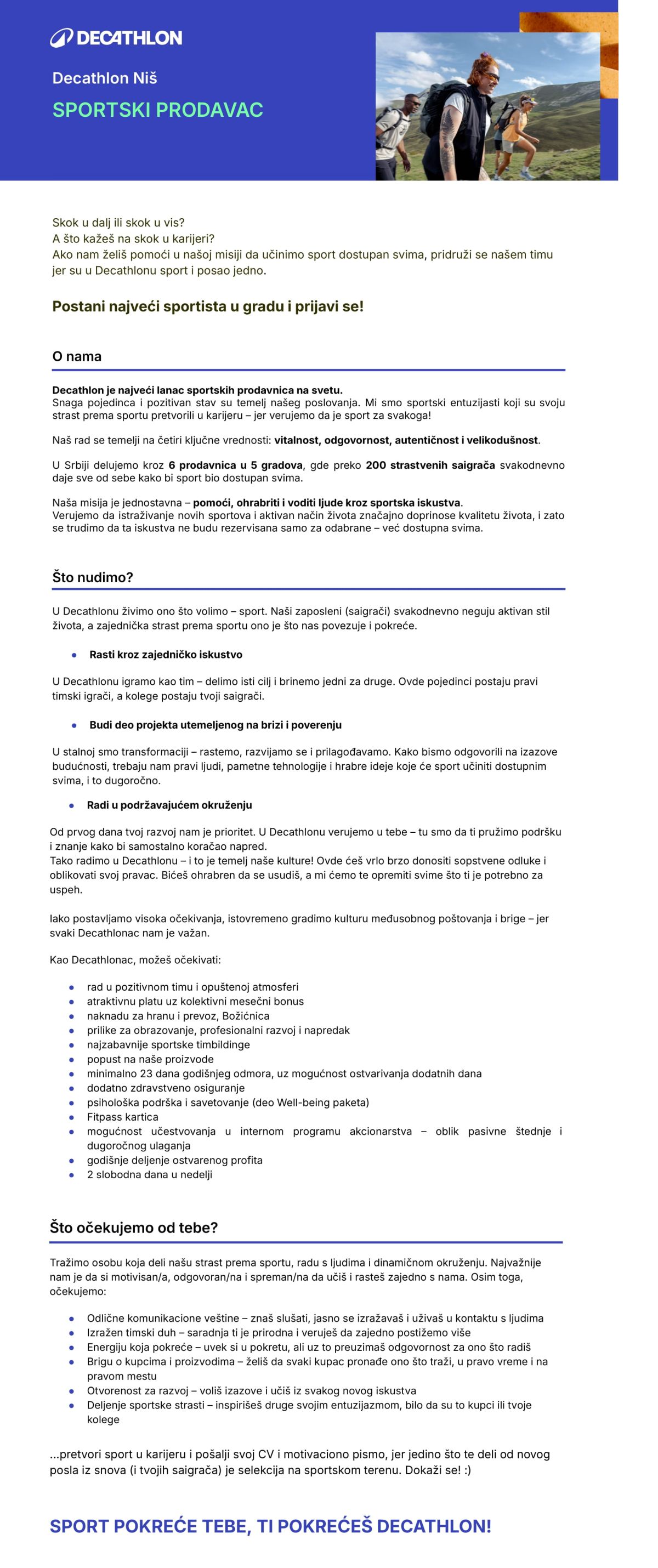 Decathlon d.o.o. je najveći svetski maloprodajni lanac sportske opreme, osnovan je 1976.godine u Lilu, u Francuskoj. Misija kompanije je sport dostupan svima, a naša svrha je biti koristan za ljude i planetu. U ponudi imamo širok izbor proizvoda visokog kvaliteta za različite nivoe bavljenja sportom,…