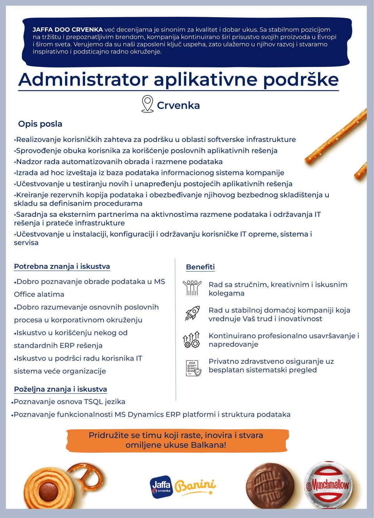 Mi smo kompanija Jaffa - jedan od najvećih proizvođača slatkiša i grickalica na Balkanu. Već dugi niz godina predstavljamo sinonim kvaliteta i dobrog ukusa. Sa višedecenijski utemeljenim kvalitetom proizvodnje, stabilnom tržišnom pozicijom i prepoznatljivim brendom, osvajamo nove prostore…