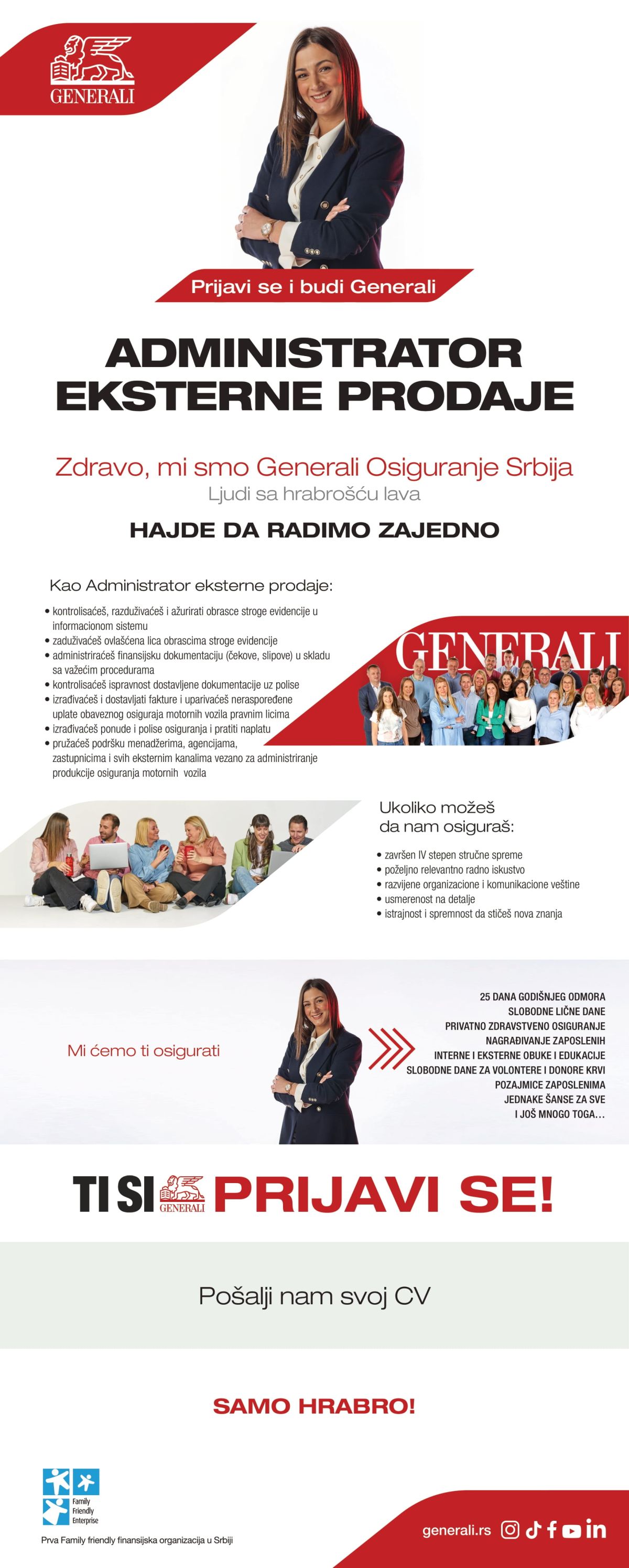 Tradicija i inovacija Generali grupa, sinonim za sigurnost i poverenje, ima tradiciju dugu gotovo dva veka. Danas, sa prisustvom u preko 50 zemalja sveta i sa preko 70.000 zaposlenih, ponosimo se internacionalnim duhom koji se konstantno razvija. Na domaćem tržištu poslujemo pod nazivom Generali Osiguranje Srbija još od 2006. godine i druga smo po veličini osiguravajuća kompanija u zemlji. Pored toga što smo lideri u osiguranju života i dobrovoljnom zdravstvenom osiguranju, pružamo vrhunske…