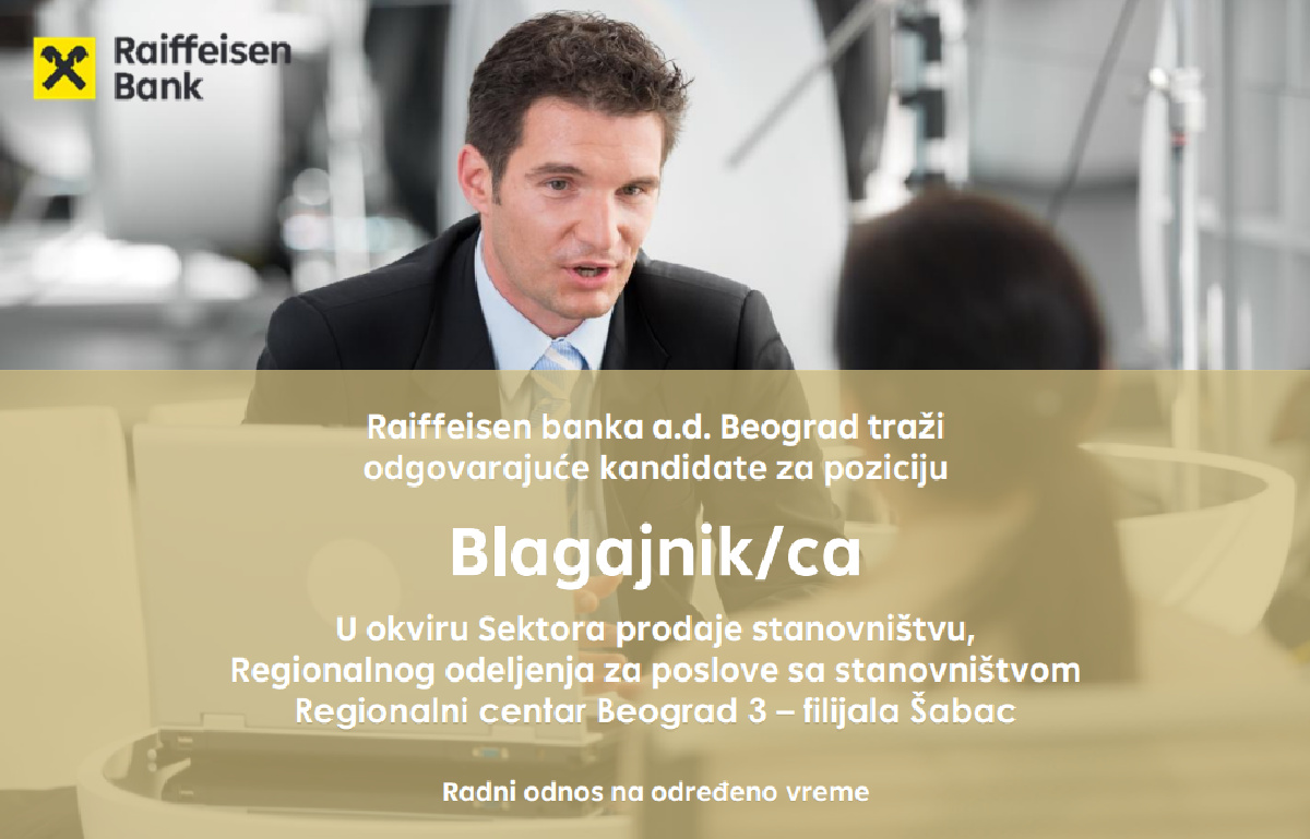 Raiffeisen banka jedna je od vodećih banaka po kvalitetu i brzini usluge koju pruža svojim klijentima širom Srbije. U cilju kreiranja superiornog korisničkog iskustva, među prvima smo započeli digitalnu transformaciju poslovanja, po čemu smo prepoznati kao lider na bankarskom tržištu Srbije. U našim filijalama dočekaće te način razmišljanja koji podstiče fleksibilnost, brzo učenje, timski rad i kontinuirano poboljšanje, kao i kultura međusobnog razumevanja, poštovanja i poverenja. Ukoliko deliš naše vrednosti i ako želiš da stekneš nova znanja i iskustva u oblasti modernog bankarstva, prijavi se!