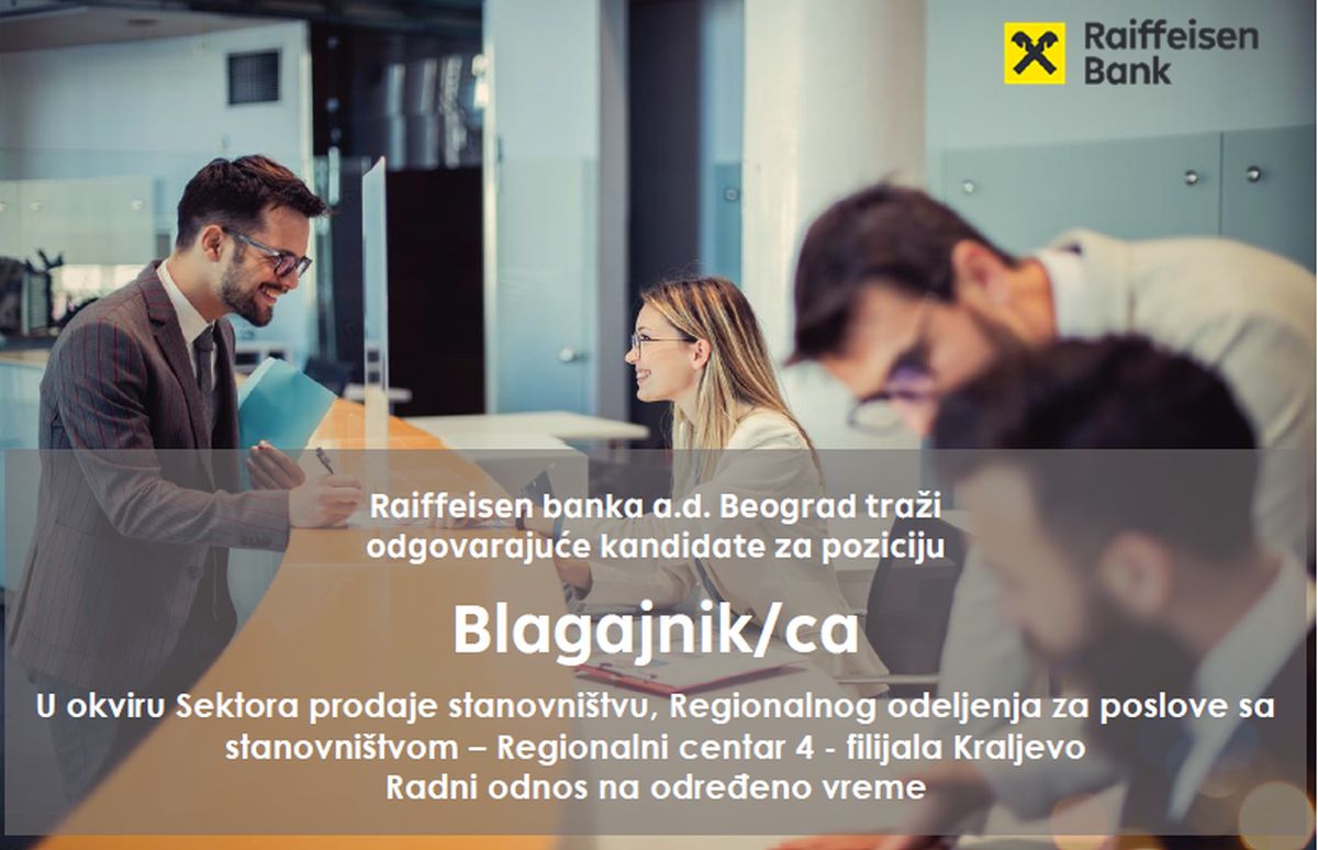 Raiffeisen banka jedna je od vodećih banaka po kvalitetu i brzini usluge koju pruža svojim klijentima širom Srbije. U cilju kreiranja superiornog korisničkog iskustva, među prvima smo započeli digitalnu transformaciju poslovanja, po čemu smo prepoznati kao lider na bankarskom tržištu Srbije. U našim filijalama dočekaće te način razmišljanja koji podstiče fleksibilnost, brzo učenje, timski rad i kontinuirano poboljšanje, kao i kultura međusobnog razumevanja, poštovanja i poverenja. Ukoliko deliš naše vrednosti i ako želiš da stekneš nova znanja i iskustva u oblasti modernog bankarstva, prijavi se!