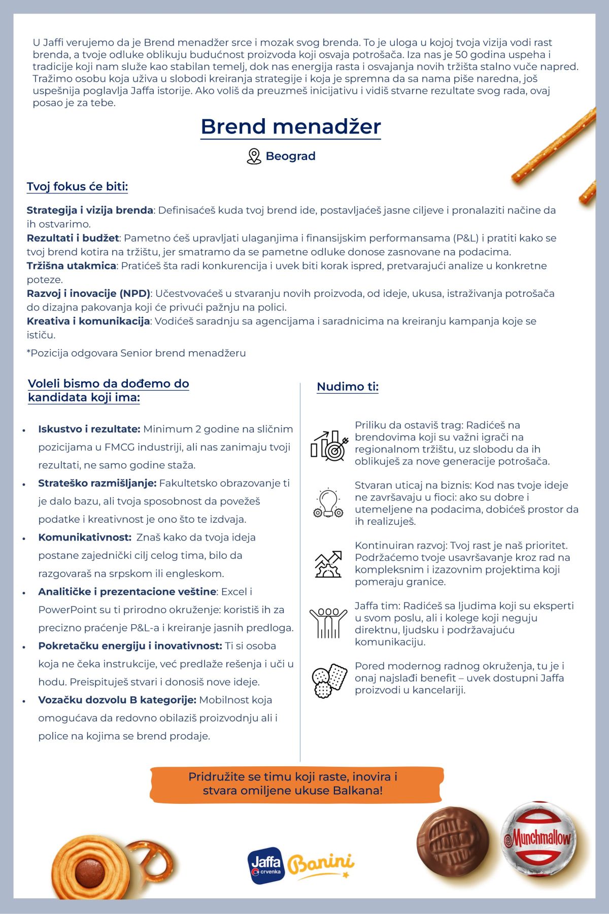 Mi smo kompanija Jaffa - jedan od najvećih proizvođača slatkiša i grickalica na Balkanu. Već dugi niz godina predstavljamo sinonim kvaliteta i dobrog ukusa. Sa višedecenijski utemeljenim kvalitetom proizvodnje, stabilnom tržišnom pozicijom i prepoznatljivim brendom, osvajamo nove prostore…