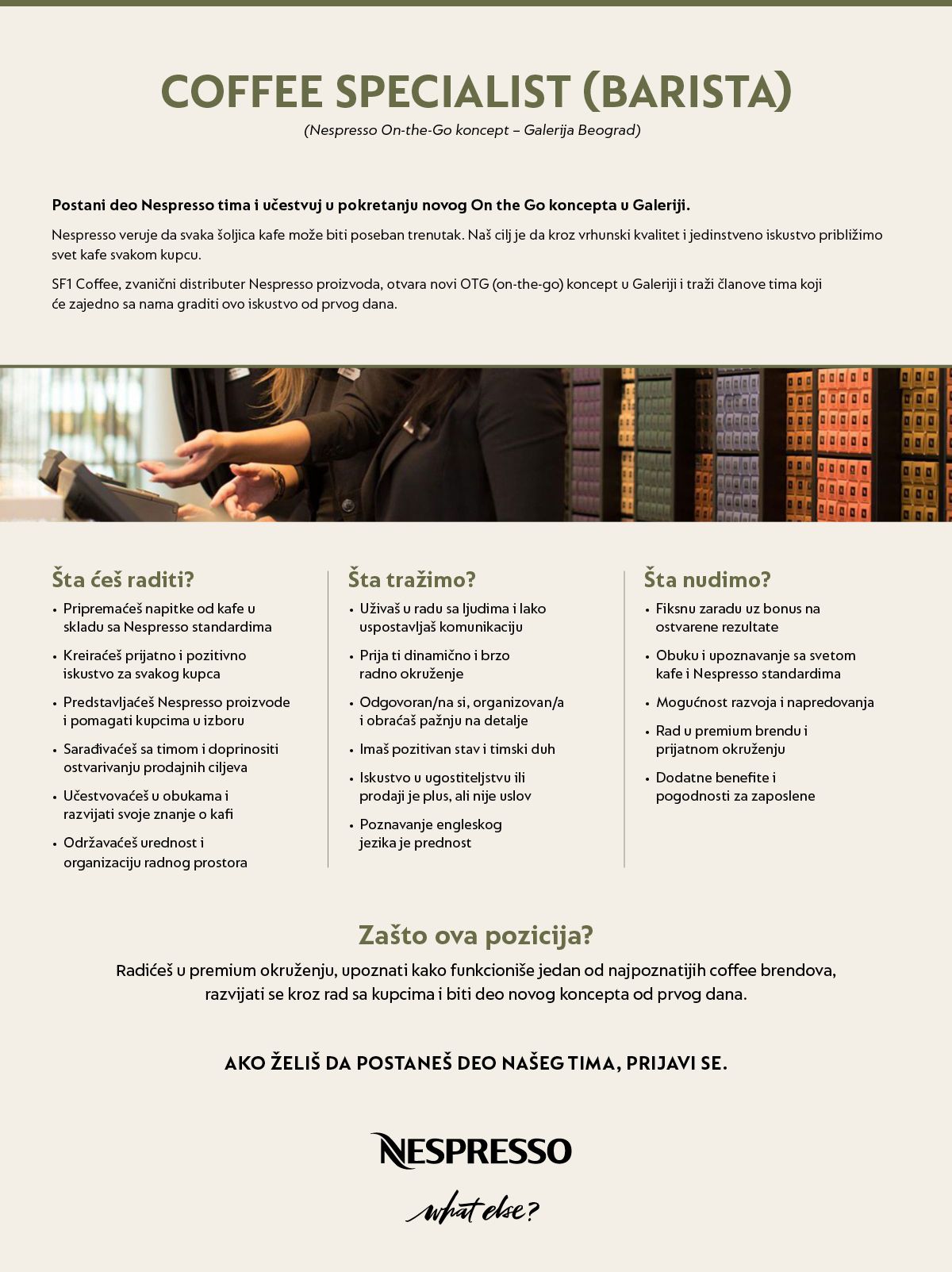 “SF1 Coffee” d.o.o. je generalni i ekskluzivni distributer Nespresso kafe u regionu, koji je svetski pionir u proizvodnji dozirane kafe vrhunskog kvalitetaNespresso priča počela je jednostavnom idejom: omogućiti svima da kreiraju savršenu šoljicu espresso kafe - baš kao i iskusni barista. Od svog početka 1986. godine, Nespresso je redefinisao i revolucionirao način na koji milioni ljudi uživaju u espresso kafi. To je oblikovalo globalnu kulturu ispijanja kafe. Nespresso je fokusiran da svojim…