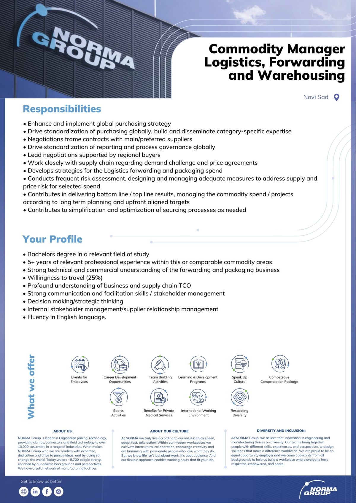 NORMA Grupa je lider na svetskom tržištu u oblasti Tehnologije konstruisanih spona i spojnica. Nudi više od 35.000 proizvoda visokog kvaliteta i rešenja za gotovo 10.000 aktivnih korisnika širom sveta. Kompanija proizvodi i prodaje široku paletu inovativnih rešenja u kategorijama spona, spojnica i fluid programa za različite klijente u više od 80 zemalja. NORMA Srbija razvija i proizvodi najinovativnije, na plastici zasnovane, komponente i sisteme iz oblasti Tehnologija spajanja za automobilsku…