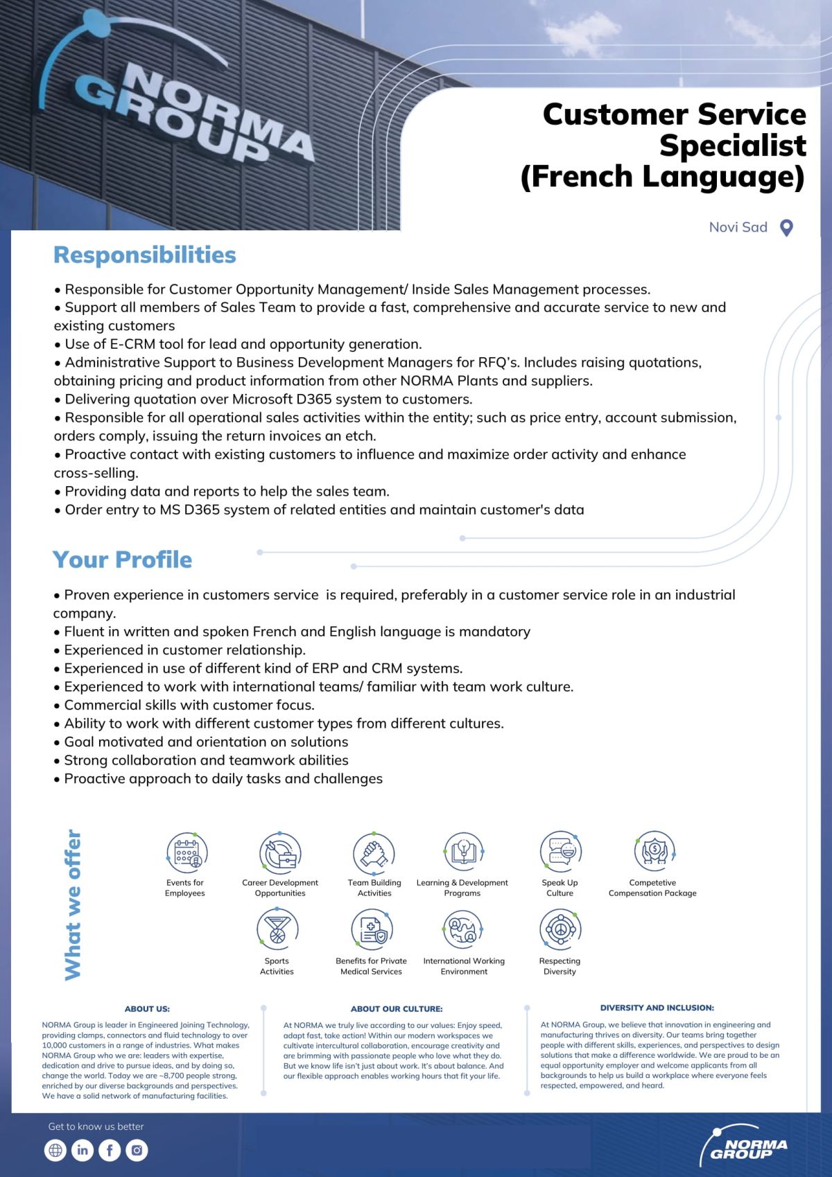 NORMA Grupa je lider na svetskom tržištu u oblasti Tehnologije konstruisanih spona i spojnica. Nudi više od 35.000 proizvoda visokog kvaliteta i rešenja za gotovo 10.000 aktivnih korisnika širom sveta. Kompanija proizvodi i prodaje široku paletu inovativnih rešenja u kategorijama spona, spojnica i fluid programa za različite klijente u više od 80 zemalja. NORMA Srbija razvija i proizvodi najinovativnije, na plastici zasnovane, komponente i sisteme iz oblasti Tehnologija spajanja za automobilsku…