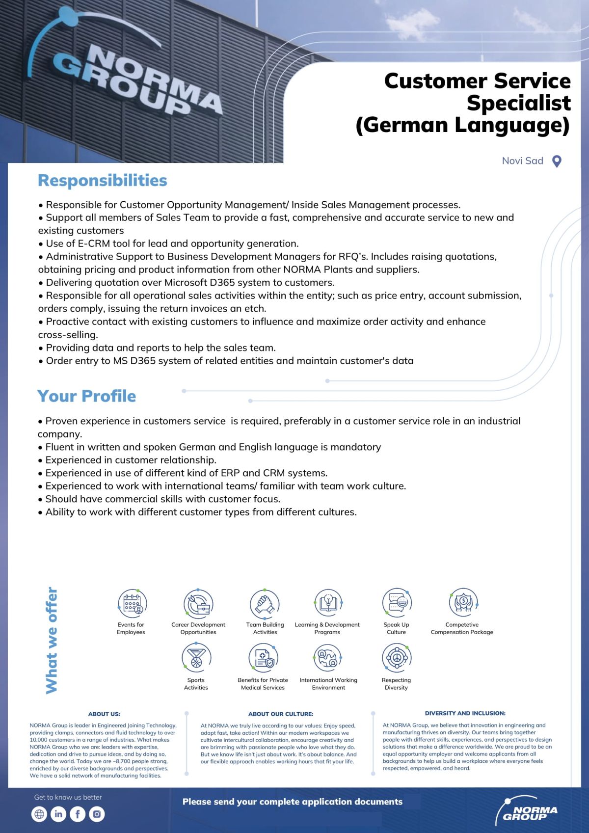 NORMA Grupa je lider na svetskom tržištu u oblasti Tehnologije konstruisanih spona i spojnica. Nudi više od 35.000 proizvoda visokog kvaliteta i rešenja za gotovo 10.000 aktivnih korisnika širom sveta. Kompanija proizvodi i prodaje široku paletu inovativnih rešenja u kategorijama spona, spojnica i fluid programa za različite klijente u više od 80 zemalja. NORMA Srbija razvija i proizvodi najinovativnije, na plastici zasnovane, komponente i sisteme iz oblasti Tehnologija spajanja za automobilsku…