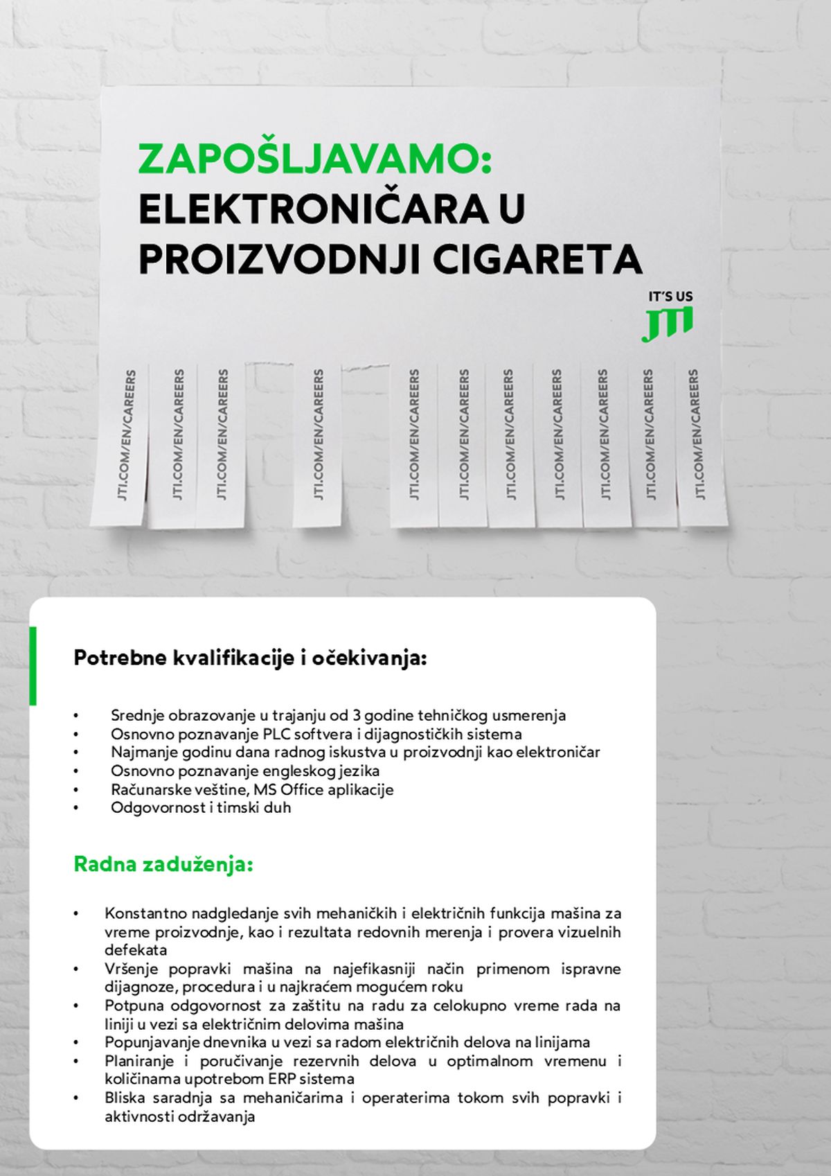 Kao globalni lider, JTI posluje u više od 130 zemalja širom sveta. U Srbiji smo prisutni od 2006. godine i angažujemo više od 3.000 ljudi, što nas čini najvećim poslodavcem u duvanskoj industriji. Naša fabrika u Senti, kancelarija u Beogradu i mreža podrške širom zemlje čine JTI kompanijom gde svaki zaposleni doprinosi zajedničkom uspehu. U JTI-ju verujemo da prava inovacija nastaje iz slobode da budemo svoji. Posvećeni smo stvaranju radnog okruženja koje podržava razvoj kreativnosti, učenja i…