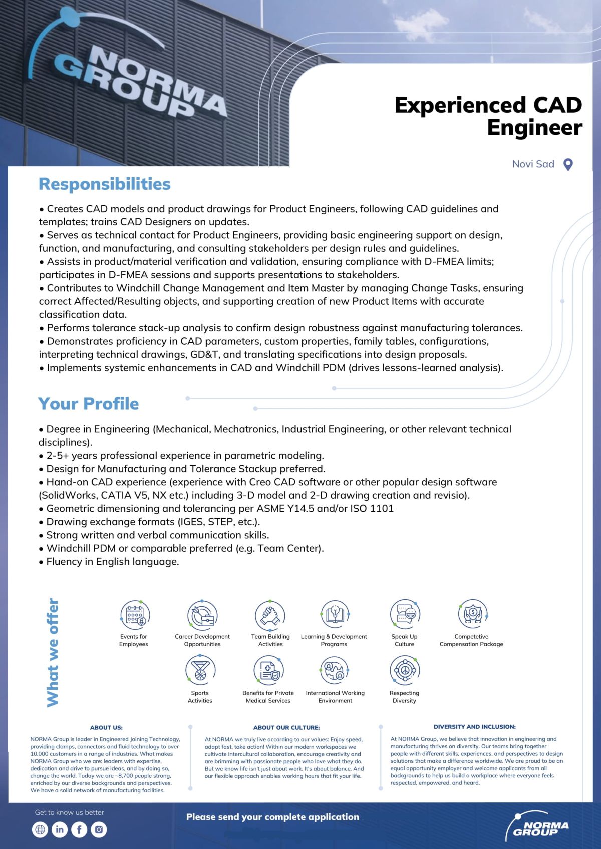 NORMA Grupa je lider na svetskom tržištu u oblasti Tehnologije konstruisanih spona i spojnica. Nudi više od 35.000 proizvoda visokog kvaliteta i rešenja za gotovo 10.000 aktivnih korisnika širom sveta. Kompanija proizvodi i prodaje široku paletu inovativnih rešenja u kategorijama spona, spojnica i fluid programa za različite klijente u više od 80 zemalja. NORMA Srbija razvija i proizvodi najinovativnije, na plastici zasnovane, komponente i sisteme iz oblasti Tehnologija spajanja za automobilsku…