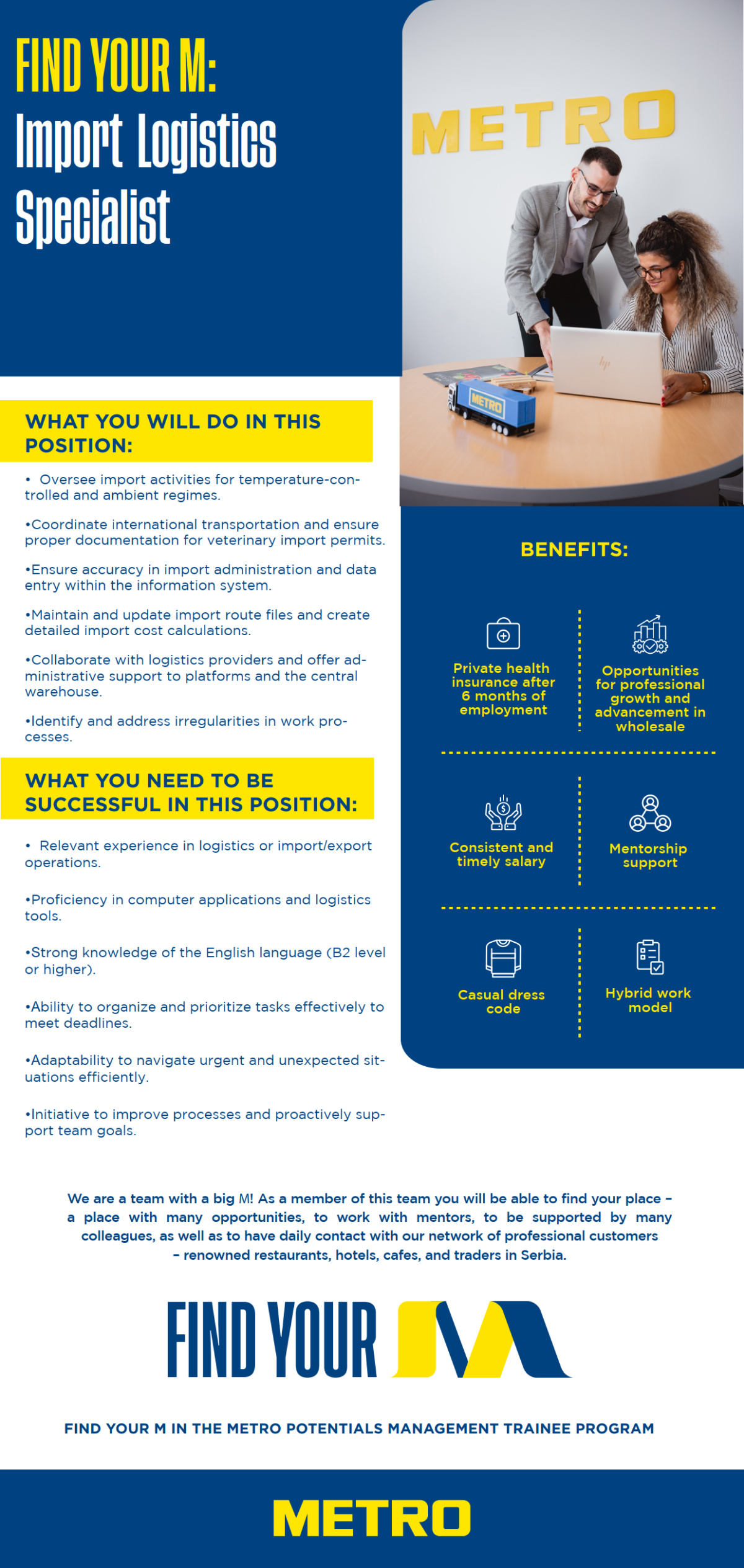 METRO pripada internacionaloj METRO AG Grupi, koja posluje u više od 30 zemalja sa blizu 700 radnji širom sveta. Naša misija je da podržimo biznise malih i srednjih preduzetnika, pre svega iz HoReCa i trgovinskog sektora, što nas čini jedinsvenim na tržištu u Srbiji od Palića do Niša. Skoro 20…