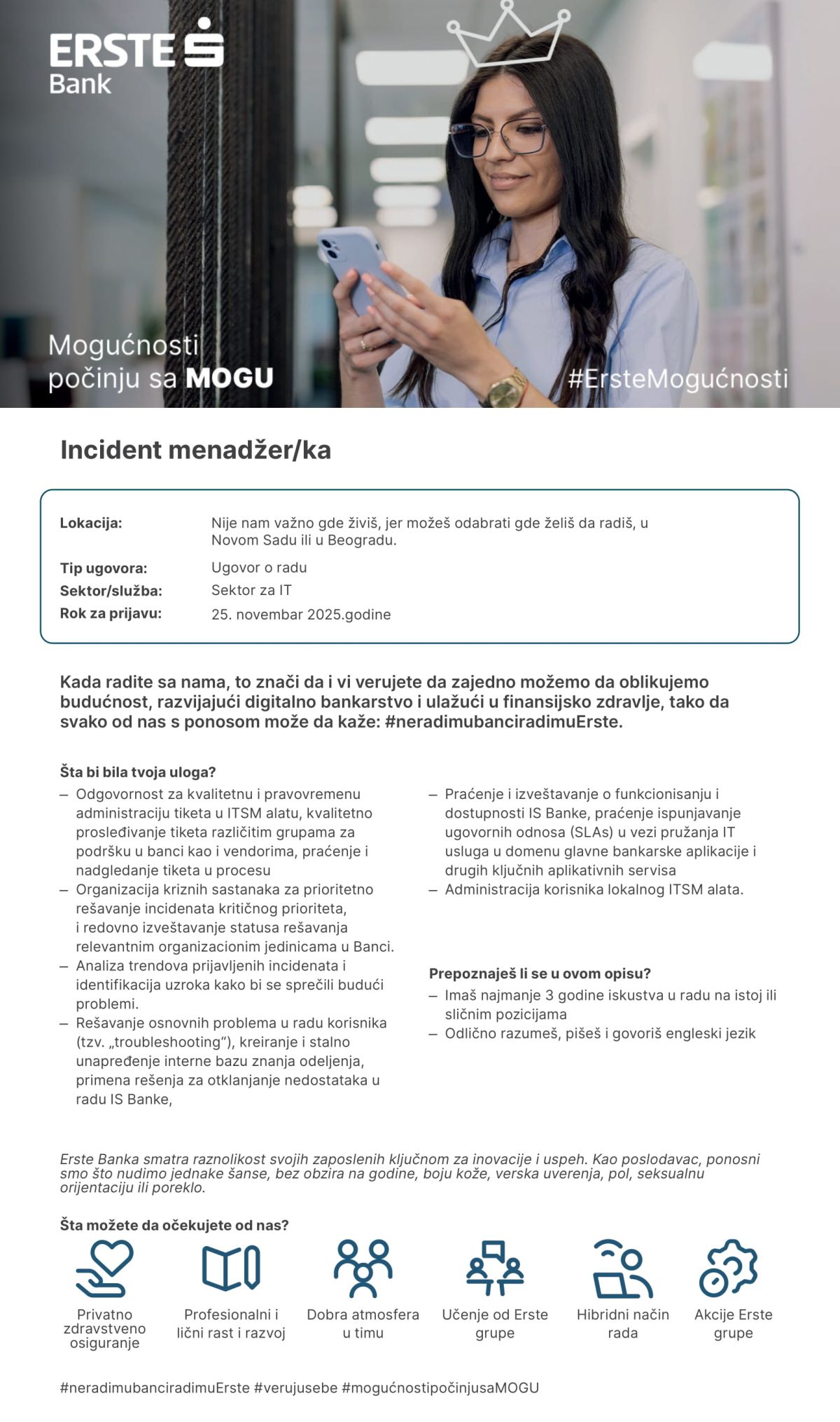 Mi smo ERSTE, gde Mogućnosti počinju sa MOGU Zamisli sebe u svetu mogućnosti uz ljude koji te podržavaju, inspirišu i gde možeš da da iskažeš svoju jedinstvenost kreirajući posebnu vrednost za sve naše klijente.  To je ERSTE. Mi verujemo u radno okruženje u kojem se neguje zajedništvo, sloboda da stvaramo i gde se slave uspesi. Otvoreni smo prema novim idejama, jer izazove vidimo kao priliku za učenje i razvoj. Kada si deo našeg tima onda uvek imaš nekoga koga možeš da pitaš kako i zašto.…