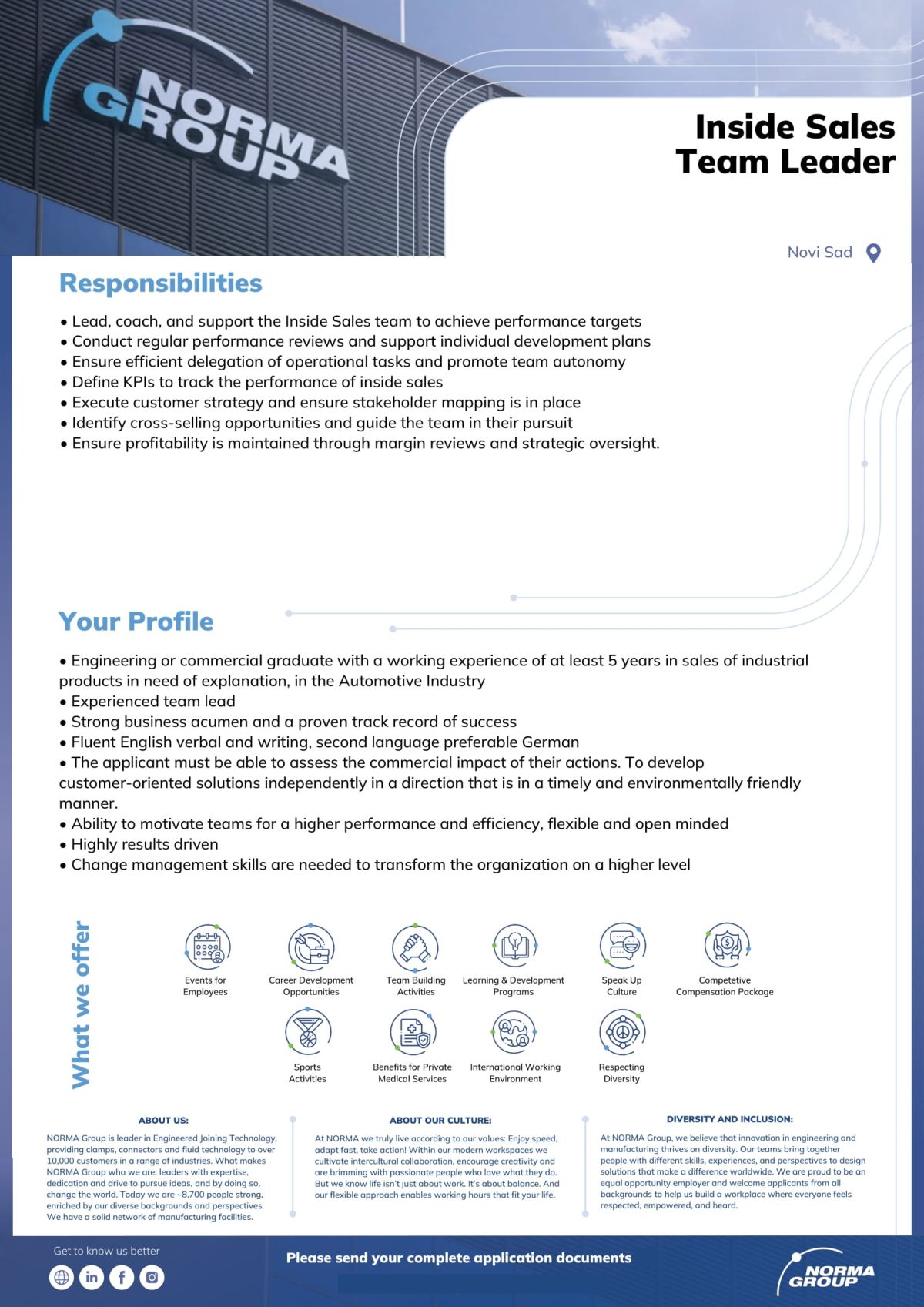 NORMA Grupa je lider na svetskom tržištu u oblasti Tehnologije konstruisanih spona i spojnica. Nudi više od 35.000 proizvoda visokog kvaliteta i rešenja za gotovo 10.000 aktivnih korisnika širom sveta. Kompanija proizvodi i prodaje široku paletu inovativnih rešenja u kategorijama spona, spojnica i fluid programa za različite klijente u više od 80 zemalja. NORMA Srbija razvija i proizvodi najinovativnije, na plastici zasnovane, komponente i sisteme iz oblasti Tehnologija spajanja za automobilsku…