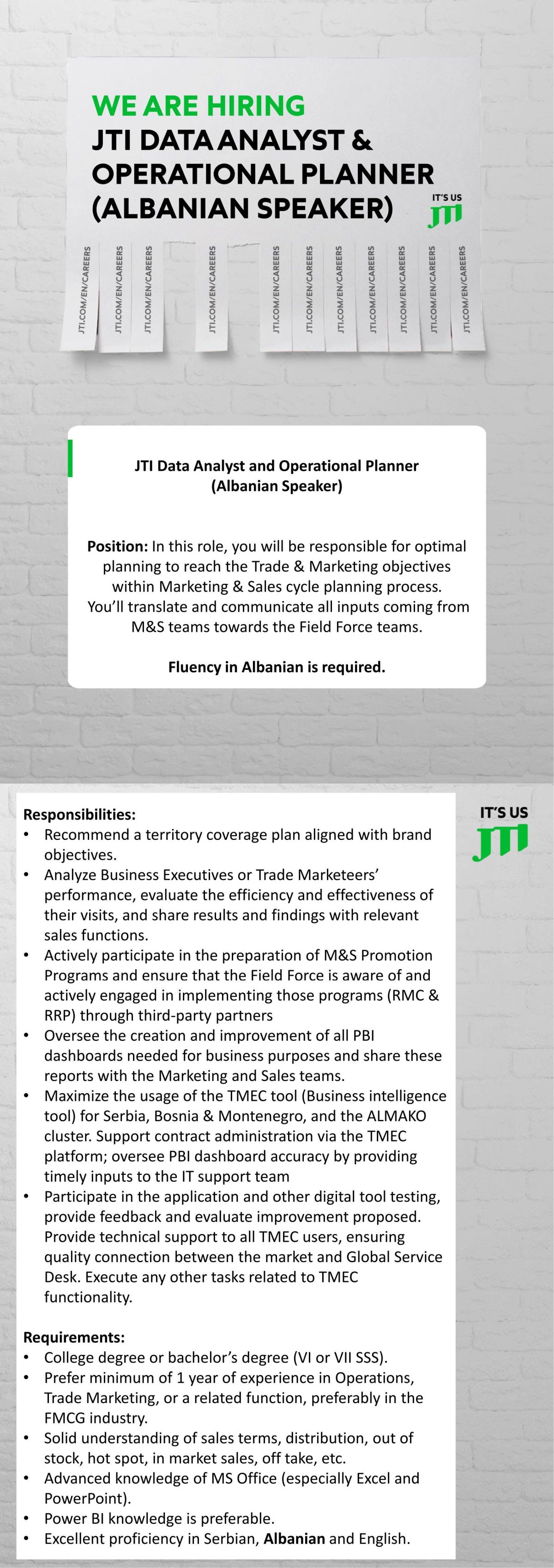 JTI Data Analyst and Operational Planner (Albanian speaker)