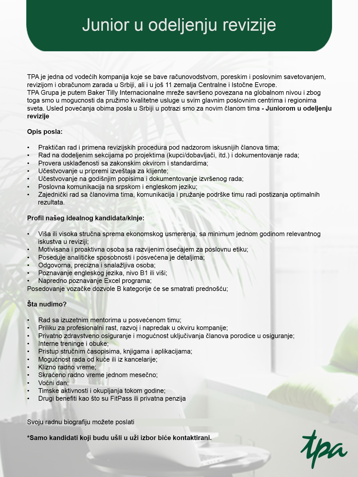 12 zemalja. 1 kompanija. TPA Revizija jedna je od vodećih kompanija u oblasti finansijskog savetovanja i revizije u Srbiji kao i u centralnoj i jugoistočnoj Evropi. Imamo oko 1.850 zaposlenih u Austriji, Albaniji, Bugarskoj, Hrvatskoj, Poljskoj, Rumuniji, Srbiji, Slovačkoj, Sloveniji, Crnoj Gori, Češkoj Republici i Mađarskoj. Naše usluge uključuju finansijsko savetovanje i reviziju. Najviši nivo profesionalnosti, trajno razvijanje naših sposobnosti i praktične primene i…