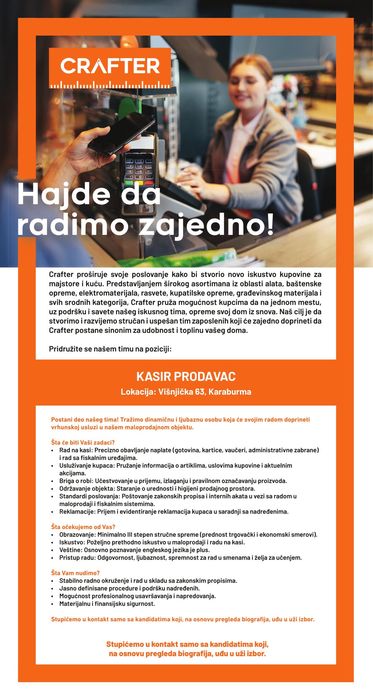 CRAFTER je novo mesto na kojem počinje i završava svaki kućni projekat. Ovde ćeš pronaći vrhunske materijale i alate, ali razlika nije u proizvodima – razliku prave usluge koje nudimo. CRAFTER može da obezbedi kompletan servis za svaki tvoj projekat, od početka do kraja. Od razumevanja i unapređenja početne ideje do uspešne realizacije. Okupljanje je početak, zajedništvo je napredak a timski rad je uspeh! - Henri Ford Bilo da si profesionalni majstor, zanatlija ili posvećeni amater sa godinama…