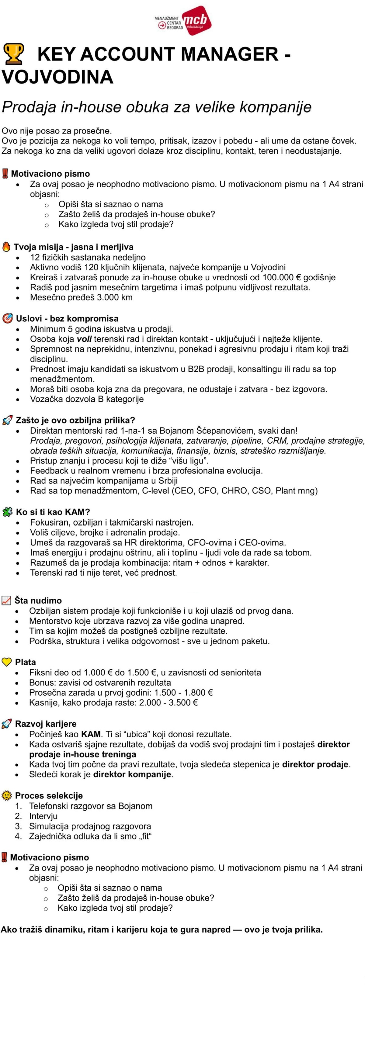 Menadžment Centar Beograd je broj 1 u razvoju menadžera u Srbiji. Osnovani smo 2001.godine i sa 25 zaposlenih najveća smo kompanija za obuku menadžera u Srbiji. Naši klijenti su najbolje kompanije u Srbiji i regionu: Telekom Srbija, NIS AD, Hemofarm, Carlsberg, Apatinska pivara, SBB, DDOR Novi Sad, itd Naši proizvodi su: obuke zaposlenih konsalting kongresi Poslujemo kroz četiri divizije: Finansije & Controlling Factory Prodaja & Pregovaranje Soft skills Naši strateški…