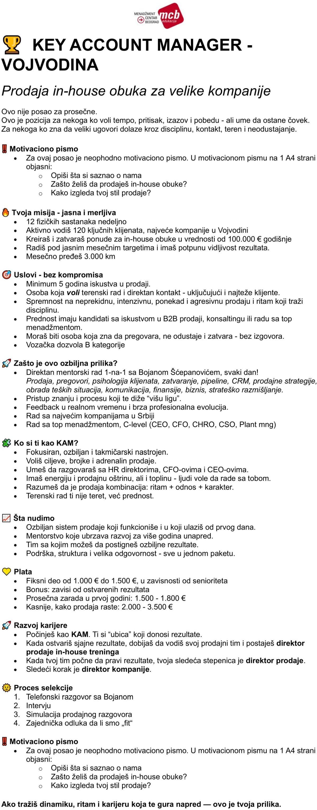 Menadžment Centar Beograd je broj 1 u razvoju menadžera u Srbiji. Osnovani smo 2001.godine i sa 25 zaposlenih najveća smo kompanija za obuku menadžera u Srbiji. Naši klijenti su najbolje kompanije u Srbiji i regionu: Telekom Srbija, NIS AD, Hemofarm, Carlsberg, Apatinska pivara, SBB, DDOR Novi Sad, itd Naši proizvodi su: obuke zaposlenih konsalting kongresi Poslujemo kroz četiri divizije: Finansije & Controlling Factory Prodaja & Pregovaranje Soft skills Naši strateški…