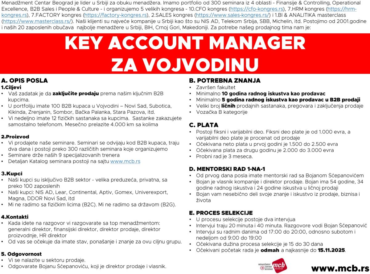 Menadžment Centar Beograd je broj 1 u razvoju menadžera u Srbiji. Osnovani smo 2001.godine i sa 25 zaposlenih najveća smo kompanija za obuku menadžera u Srbiji. Naši klijenti su najbolje kompanije u Srbiji i regionu: Telekom Srbija, NIS AD, Hemofarm, Carlsberg, Apatinska pivara, SBB, DDOR Novi Sad, itd Naši proizvodi su: obuke zaposlenih konsalting kongresi Poslujemo kroz četiri divizije: Finansije & Controlling Factory Prodaja & Pregovaranje Soft skills Naši strateški…