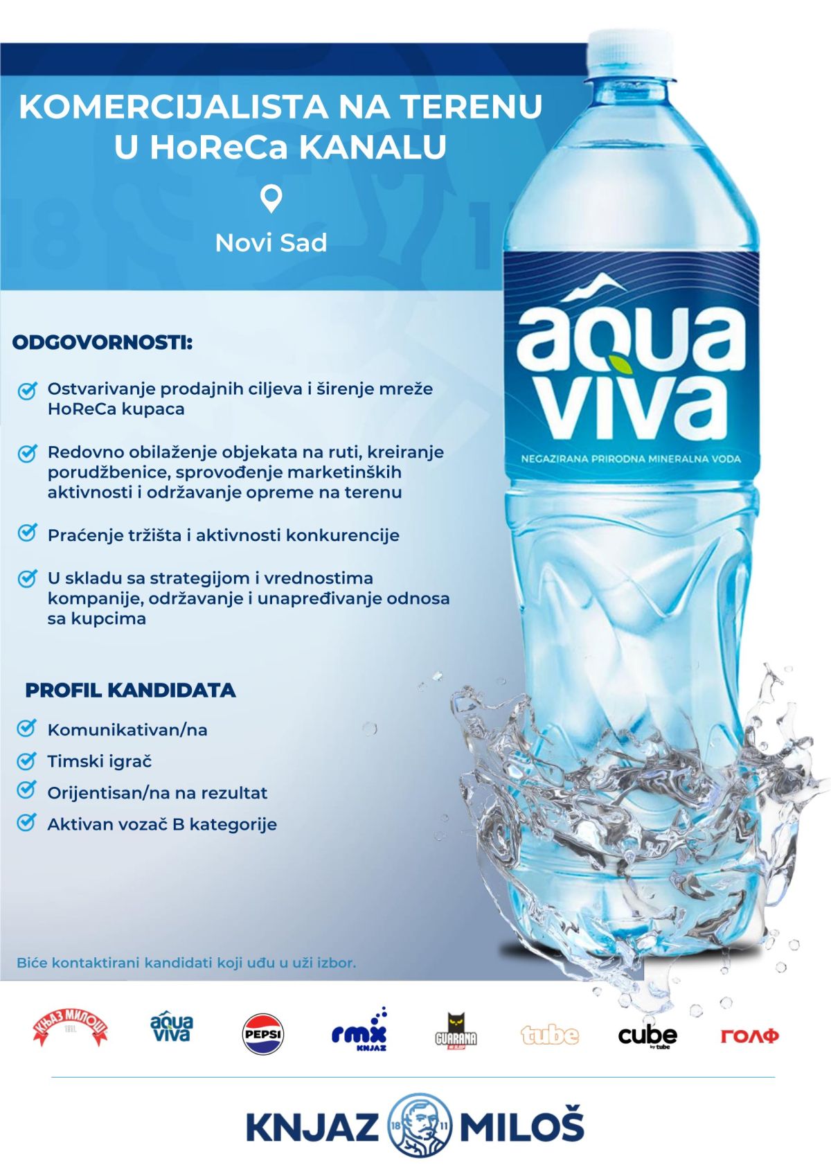 Mi smo Knjaz Miloš. Ponosno autentični i fokusirani na druge. Jedan smo od najvećih proizvođača mineralne vode, bezalkoholnih i energetskih napitaka u regionu. Razvijamo, proizvodimo i plasiramo na tržište napitke vrhunskog kvaliteta koji potrošačima pružaju vitalnost, osveženje i energiju svakog dana. Brinemo o drugima, sagledavamo stvari i „iz tuđih cipela“, vodeći se činjenicama i empatijom. Sve to, na temeljima imena i tradicije duže od dva veka, sa jasnom vizijom budućnosti. Gradimo…