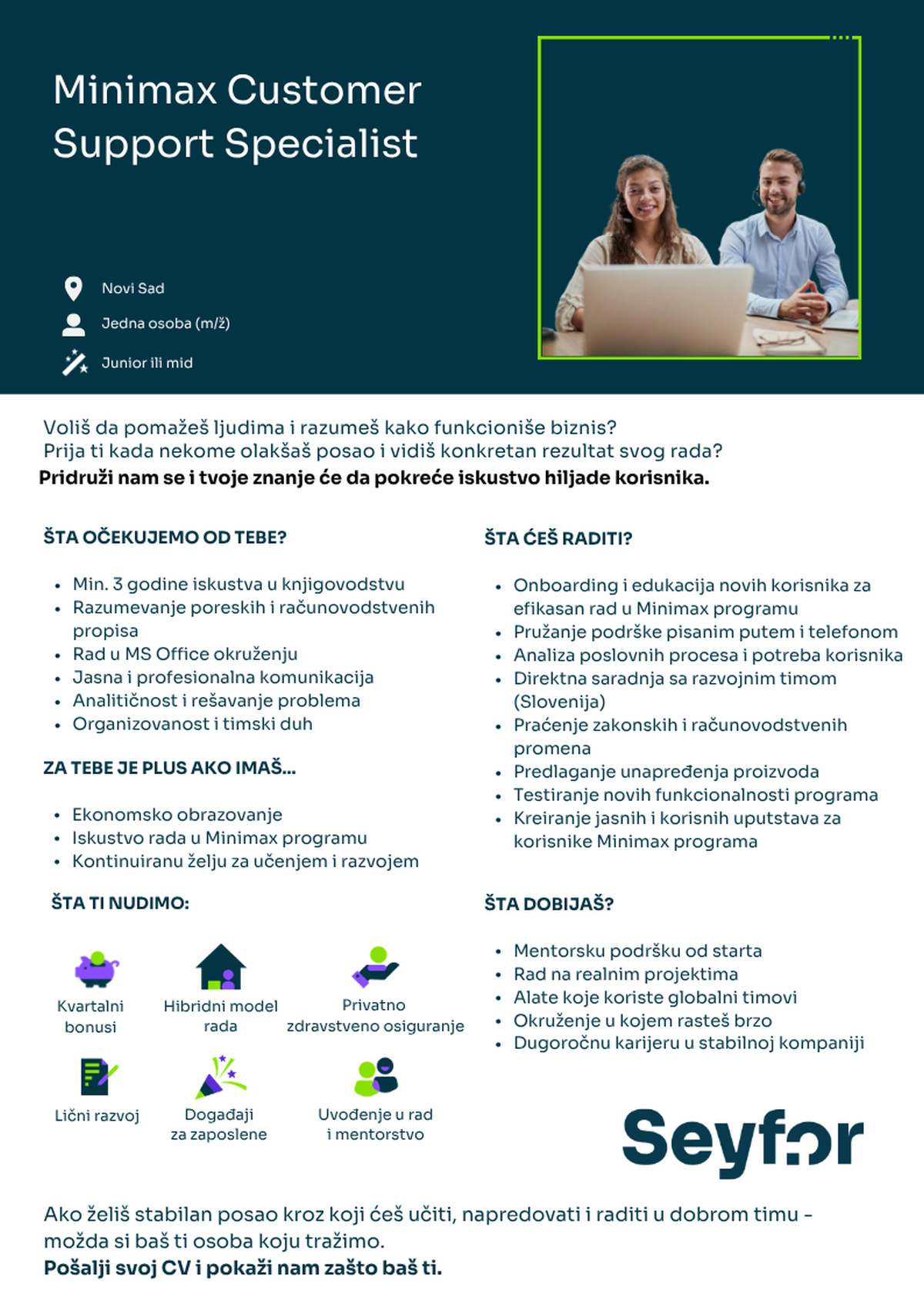 Seyfor Adriatik – kreiramo softverska rešenja koja pokreću biznise budućnosti U Seyforu verujemo da tehnologija ima moć da pojednostavi poslovanje i oslobodi vreme za ono što je zaista važno – ljude i ideje. Zato svakog dana razvijamo pametna softverska rešenja koja pomažu kompanijama, računovodstvenim agencijama i institucijama da rade efikasnije, transparentnije i modernije. Naša rešenja – Saop, Saop Proizvodnja, Minimax, Opal i Vasco – koristi više od 50.000 klijenata širom regiona. Zajedno…