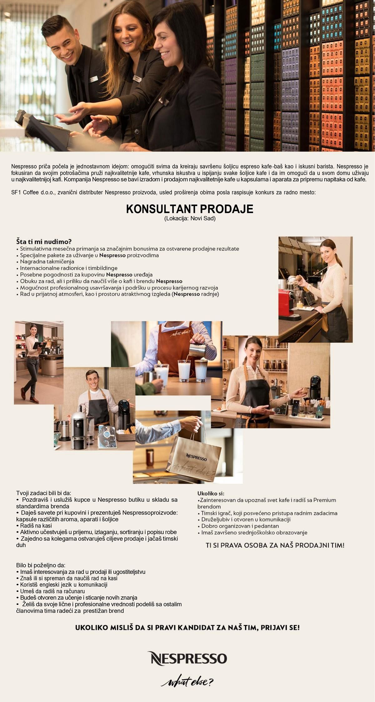 “SF1 Coffee” d.o.o. je generalni i ekskluzivni distributer Nespresso kafe u regionu, koji je svetski pionir u proizvodnji dozirane kafe vrhunskog kvalitetaNespresso priča počela je jednostavnom idejom: omogućiti svima da kreiraju savršenu šoljicu espresso kafe - baš kao i iskusni barista. Od svog početka 1986. godine, Nespresso je redefinisao i revolucionirao način na koji milioni ljudi uživaju u espresso kafi. To je oblikovalo globalnu kulturu ispijanja kafe. Nespresso je fokusiran da svojim…