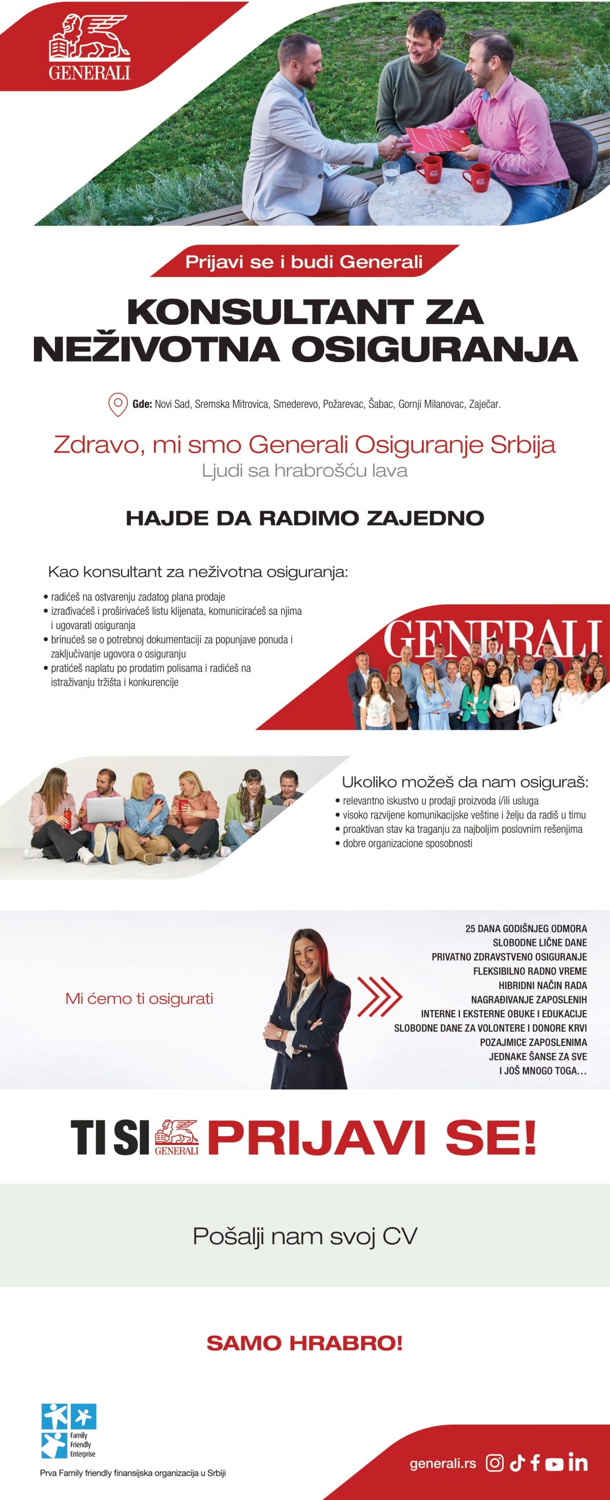 Tradicija i inovacija Generali grupa, sinonim za sigurnost i poverenje, ima tradiciju dugu gotovo dva veka. Danas, sa prisustvom u preko 50 zemalja sveta i sa preko 70.000 zaposlenih, ponosimo se internacionalnim duhom koji se konstantno razvija. Na domaćem tržištu poslujemo pod nazivom Generali Osiguranje Srbija još od 2006. godine i druga smo po veličini osiguravajuća kompanija u zemlji. Pored toga što smo lideri u osiguranju života i dobrovoljnom zdravstvenom osiguranju, pružamo vrhunske…