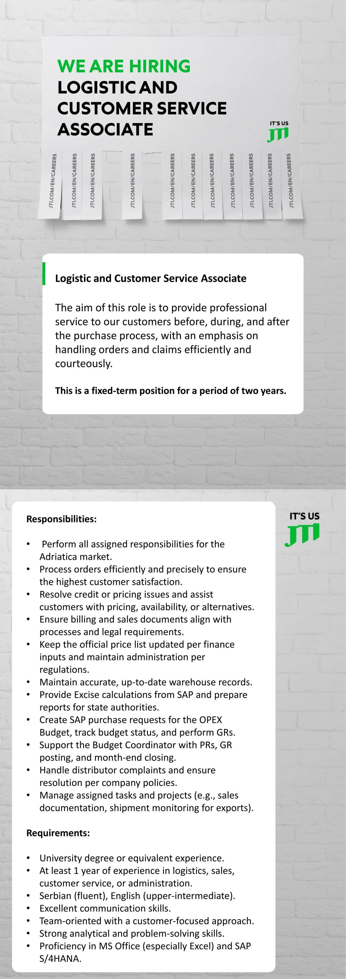 Kao globalni lider, JTI posluje u više od 130 zemalja širom sveta. U Srbiji smo prisutni od 2006. godine i angažujemo više od 3.000 ljudi, što nas čini najvećim poslodavcem u duvanskoj industriji. Naša fabrika u Senti, kancelarija u Beogradu i mreža podrške širom zemlje čine JTI kompanijom gde svaki zaposleni doprinosi zajedničkom uspehu. U JTI-ju verujemo da prava inovacija nastaje iz slobode da budemo svoji. Posvećeni smo stvaranju radnog okruženja koje podržava razvoj kreativnosti, učenja i…