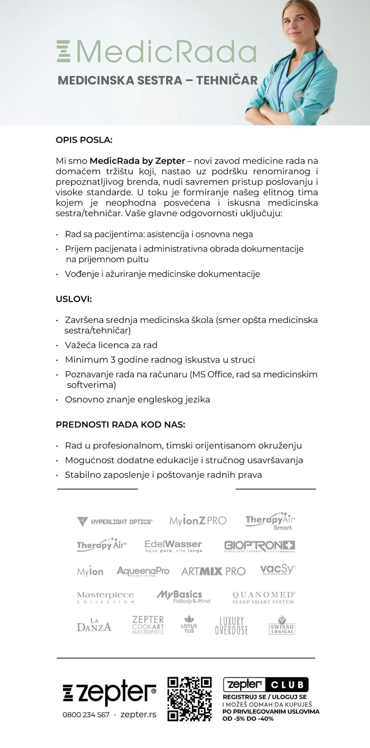 MedicRada by Zepter Vaše zdravlje je naš prioritet. Ponosni smo na Zepterov brend i našu posvećenost vrhunskim uslugama medicine rada, sistematskim pregledima, specijalističkim konsultacijama i obuci prve pomoći. Zahvaljujući Zepterovoj tehnologiji, naša klinika je jedinstvena u Evropi po najčistijem vazduhu i vodi, jer je svaka ordinacija opremljena najsavremenijim prečišćivačima. Sa sjajnom lokacijom u Beogradu, dostupnim parkingom i Zepter lojaliti programom, omogućavamo sveobuhvatnu…