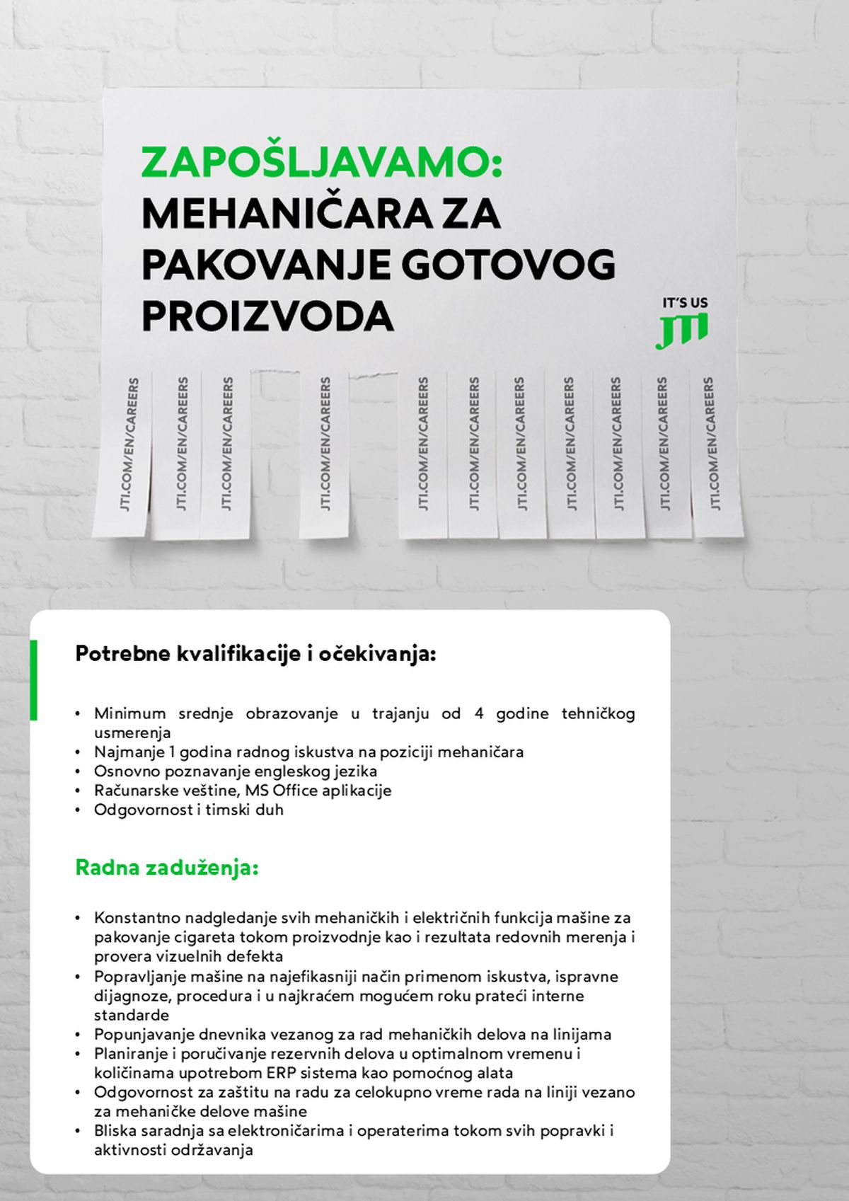 Kao globalni lider, JTI posluje u više od 130 zemalja širom sveta. U Srbiji smo prisutni od 2006. godine i angažujemo više od 3.000 ljudi, što nas čini najvećim poslodavcem u duvanskoj industriji. Naša fabrika u Senti, kancelarija u Beogradu i mreža podrške širom zemlje čine JTI kompanijom gde svaki zaposleni doprinosi zajedničkom uspehu. U JTI-ju verujemo da prava inovacija nastaje iz slobode da budemo svoji. Posvećeni smo stvaranju radnog okruženja koje podržava razvoj kreativnosti, učenja i…