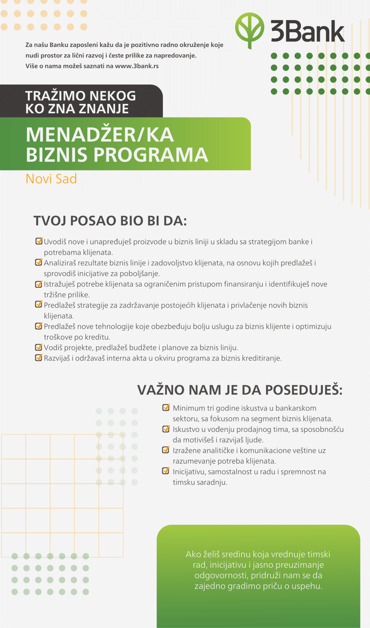 3 Banka u Srbiji postoji od 2002. godine kada je osnovana kao Opportunity štedionica, a 2007. se uspešno transformisala u banku. Od novembra 2021. Opportunity banka menja ime u 3 Banka. Misija 3 Banke je da obezbedi finansijske usluge svima koji ostvaruju pozitivan uticaj na ekonomiju, društvo i…