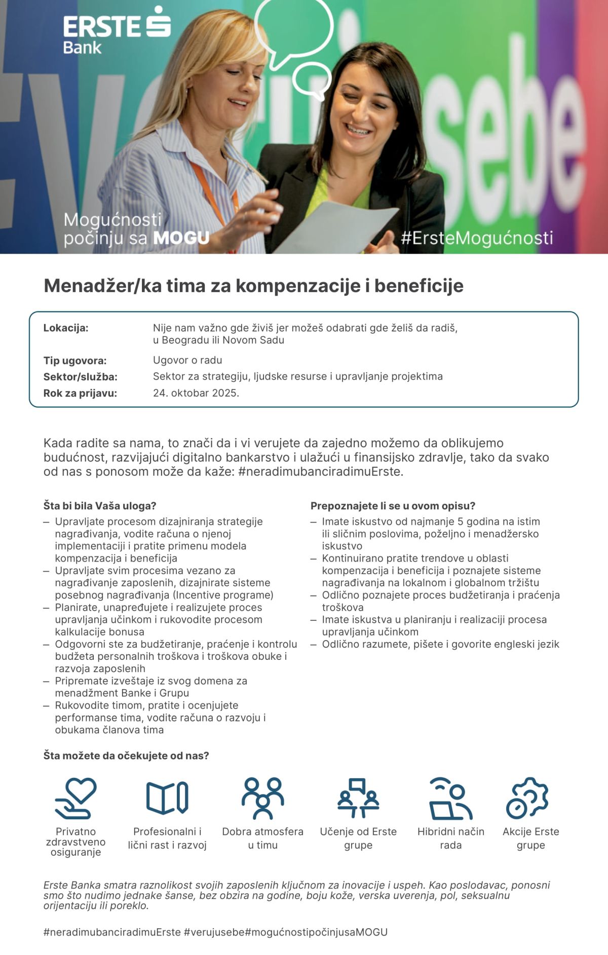 Mi smo ERSTE, gde Mogućnosti počinju sa MOGU Zamisli sebe u svetu mogućnosti uz ljude koji te podržavaju, inspirišu i gde možeš da da iskažeš svoju jedinstvenost kreirajući posebnu vrednost za sve naše klijente.  To je ERSTE. Mi verujemo u radno okruženje u kojem se neguje zajedništvo, sloboda da stvaramo i gde se slave uspesi. Otvoreni smo prema novim idejama, jer izazove vidimo kao priliku za učenje i razvoj. Kada si deo našeg tima onda uvek imaš nekoga koga možeš da pitaš kako i zašto.…