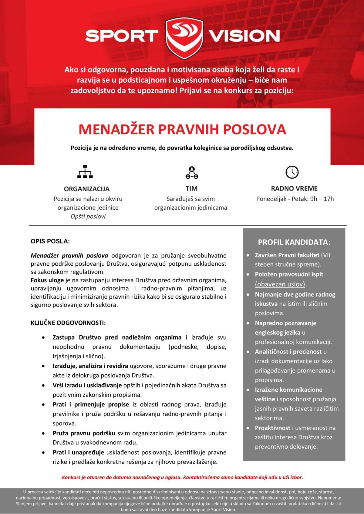 KO SMO MI? SPORT VISION je lider u prodaji sportske obuće, odeće i opreme na Balkanu. Više od 20 godina poslujemo u Srbiji kao moderna kompanija koju odlikuju fleksibilnost, profesionalizam i dinamična strategija razvoja. Naš tim čini više od 6.000 zaposlenih u 13 zemalja − Srbija, Bosna i Hercegovina, Hrvatska, Slovenija, Crna Gora, Severna Makedonija, Albanija, Rumunija, Bugarska, Grčka, Češka, Slovačka i Mađarska, a sedište kompanije nalazi se u Beogradu. Naša maloprodajna mreža broji više…