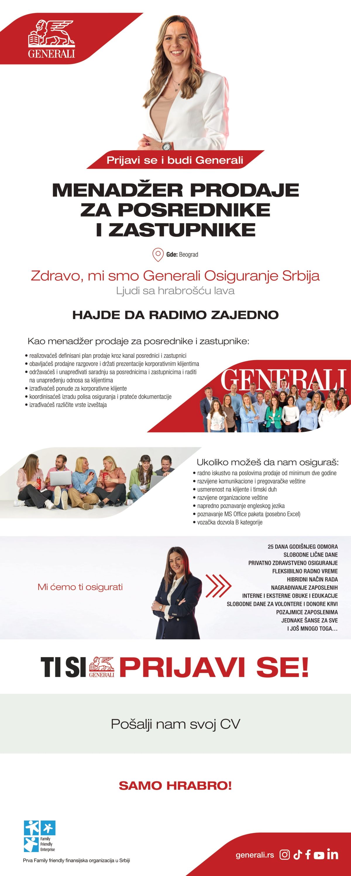 Tradicija i inovacija Generali grupa, sinonim za sigurnost i poverenje, ima tradiciju dugu gotovo dva veka. Danas, sa prisustvom u preko 50 zemalja sveta i sa preko 70.000 zaposlenih, ponosimo se internacionalnim duhom koji se konstantno razvija. Na domaćem tržištu poslujemo pod nazivom Generali Osiguranje Srbija još od 2006. godine i druga smo po veličini osiguravajuća kompanija u zemlji. Pored toga što smo lideri u osiguranju života i dobrovoljnom zdravstvenom osiguranju, pružamo vrhunske usluge…