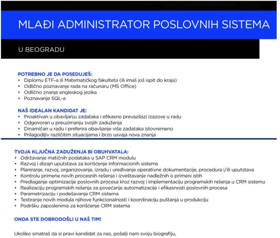 Mlađi administrator za održavanje poslovnih sistema