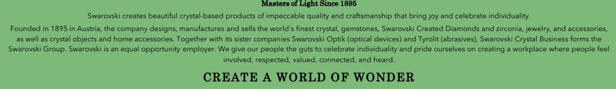 Uspešna Swarovski priča započeta je davne 1895. godine, a tvoja može da počne već danas. Ono što je 1895. godine započeto kao kompanija za proizvodnju kristala u Wattens-u, u Austriji, pretvoreno je u grupu kompanija prisutnih na svetskom nivou koja već generacijama prepoznaje činjenicu da se dugoročan uspeh kompanije ne može odvojiti od dobrobiti njenih kupaca, zaposlenih, životne sredine i društva u celini. Swarovski sa ponosom ističe da je porodična kompanija, kojom sada rukovodi peta…