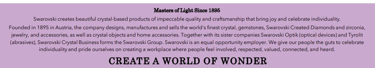Uspešna Swarovski priča započeta je davne 1895. godine, a tvoja može da počne već danas. Ono što je 1895. godine započeto kao kompanija za proizvodnju kristala u Wattens-u, u Austriji, pretvoreno je u grupu kompanija prisutnih na svetskom nivou koja već generacijama prepoznaje činjenicu da se dugoročan uspeh kompanije ne može odvojiti od dobrobiti njenih kupaca, zaposlenih, životne sredine i društva u celini. Swarovski sa ponosom ističe da je porodična kompanija, kojom sada rukovodi peta…
