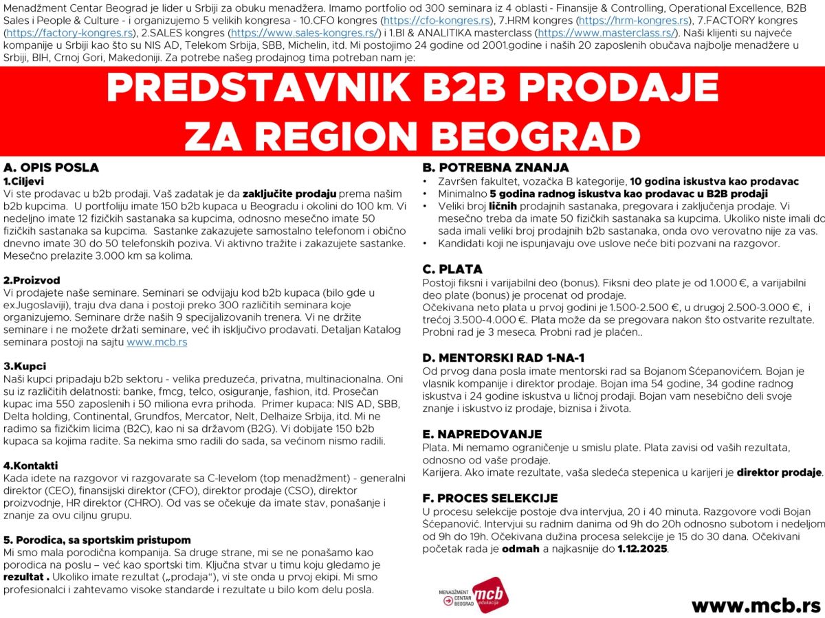 Menadžment Centar Beograd je broj 1 u razvoju menadžera u Srbiji. Osnovani smo 2001.godine i sa 25 zaposlenih najveća smo kompanija za obuku menadžera u Srbiji. Naši klijenti su najbolje kompanije u Srbiji i regionu: Telekom Srbija, NIS AD, Hemofarm, Carlsberg, Apatinska pivara, SBB, DDOR Novi Sad, itd Naši proizvodi su: obuke zaposlenih konsalting kongresi Poslujemo kroz četiri divizije: Finansije & Controlling Factory Prodaja & Pregovaranje Soft skills Naši strateški…
