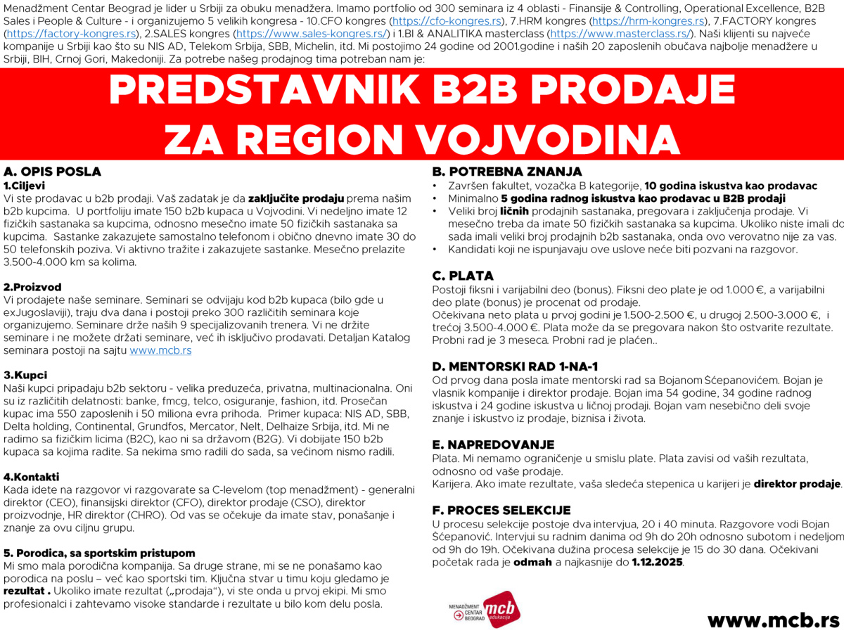 Menadžment Centar Beograd je broj 1 u razvoju menadžera u Srbiji. Osnovani smo 2001.godine i sa 25 zaposlenih najveća smo kompanija za obuku menadžera u Srbiji. Naši klijenti su najbolje kompanije u Srbiji i regionu: Telekom Srbija, NIS AD, Hemofarm, Carlsberg, Apatinska pivara, SBB, DDOR Novi Sad, itd Naši proizvodi su: obuke zaposlenih konsalting kongresi Poslujemo kroz četiri divizije: Finansije & Controlling Factory Prodaja & Pregovaranje Soft skills Naši strateški…