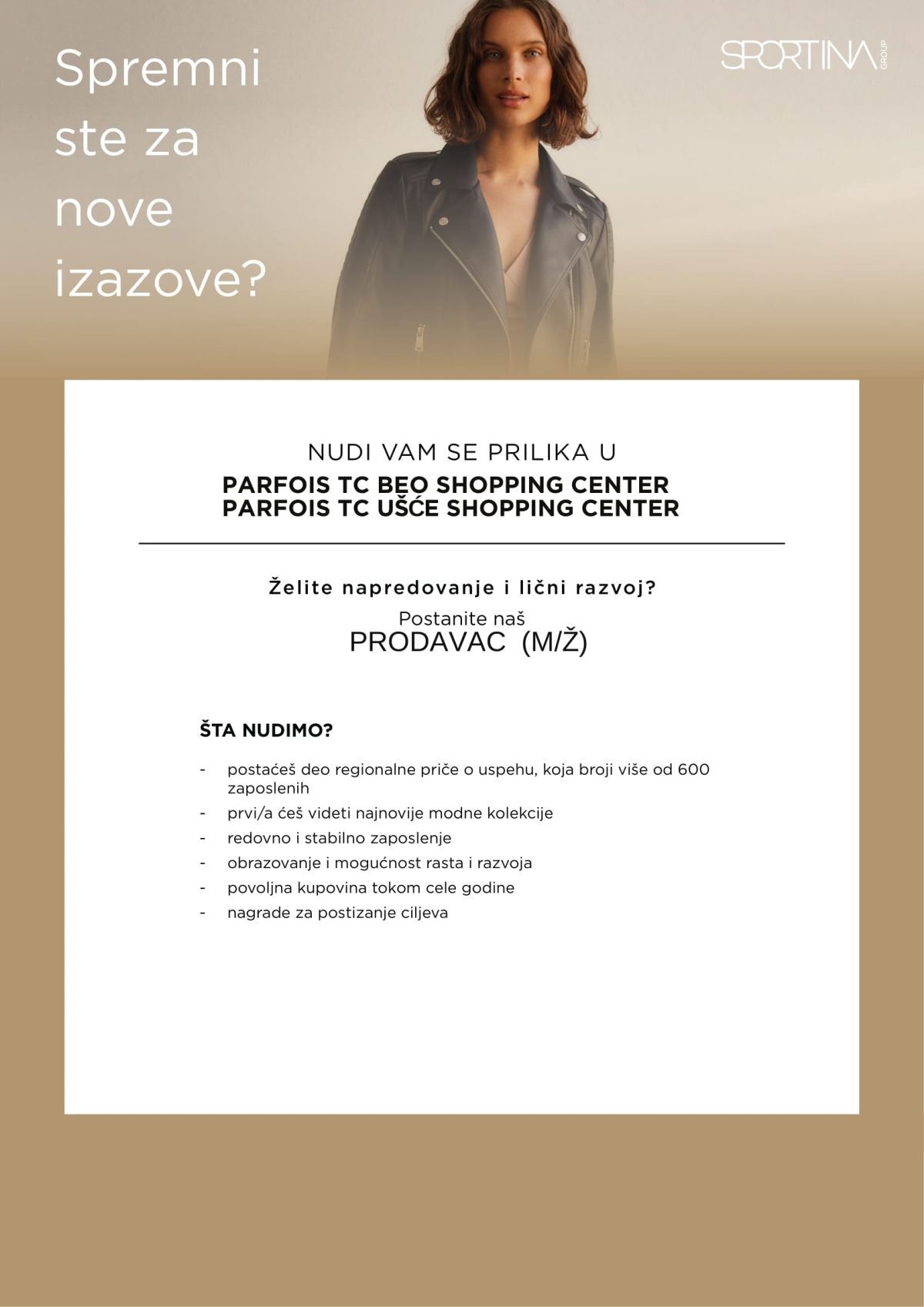 SPORTINA GROUP, je vodeći maloprodajni trgovac odeće i obuće na području Jugoistočne Europe sa više od 350 radnji i portfoliom koji broji više od 90 modnih marki svih cenovnih razreda, smeštenih u radnjama XYZ Premium Fashion Store, Armani Exchange, Sportina, Esprit, Perfois, Tom Tailor, Tally Weijl... Poslujemo u 11 država od Slovenije do Bugarske i zapošljavamo više od 2.300 ljudi.