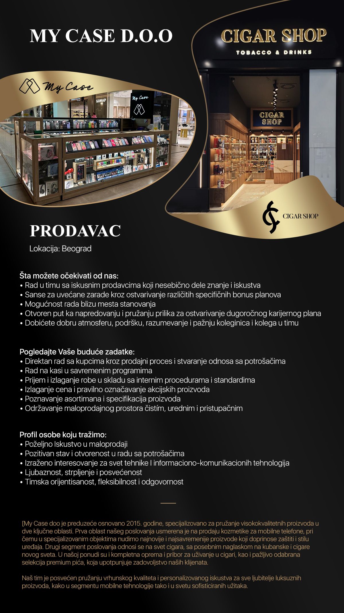 My Case doo je preduzeće osnovano 2015. godine, specijalizovano za pužanje visokokvalitetnih proizvoda u dve ključne oblasti. Prva oblast našeg poslovanja usmerena je na prodaju kozmetike za mobilne telefone, pri čemu u specijalizovanim objektima nudimo najnovije i najsavremenije proizvode koji doprinose zaštiti i stilu uređaja. Drugi segment poslovanja odnosi se na svet cigara, sa posebnim naglaskom na kubanske i cigare novog sveta. U našoj ponudi su i kompletna oprema i pribor za uživanje u…