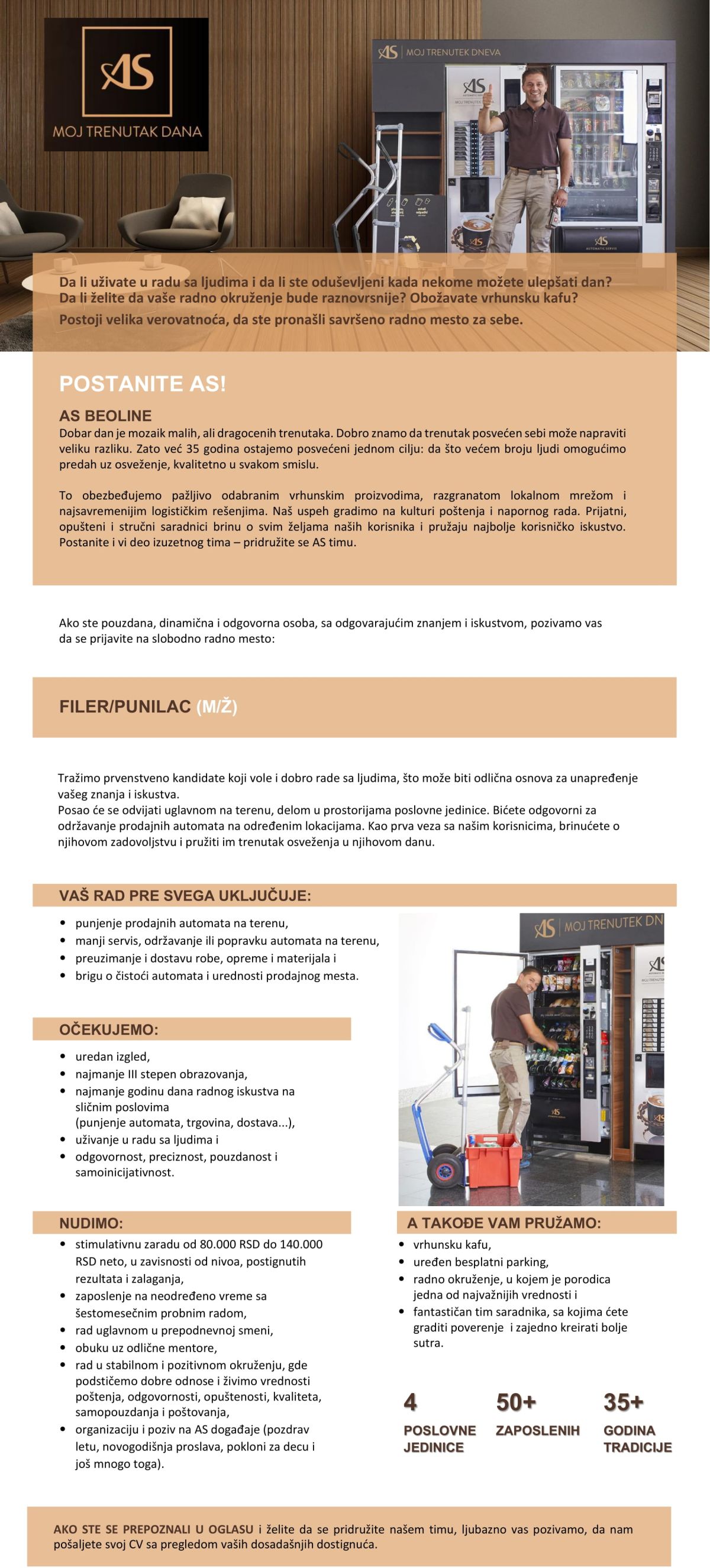 Mi smo kompanija koja pažljivo i odgovorno bira korake u budućnost. Svoju priču pišemo od 2000. godine i sa svojim bogatim iskustvom i znanjem neprestano unapređujemo naše poslovne procese. PRIČA O SREĆI Već 21 godinu pišemo Beoline priču o sreći i brinemo za vaše trenutke dana. Sklapamo poslove i povezujemo. Vašim dnevnim pauzama dajemo smisao. Otkrivamo prijateljstva. Olakšavamo čekanje. Neutralizujemo pospanost. Pokrećemo i brinemo o kvalitetu života van vašeg doma. Mi smo preduzeće, koje…