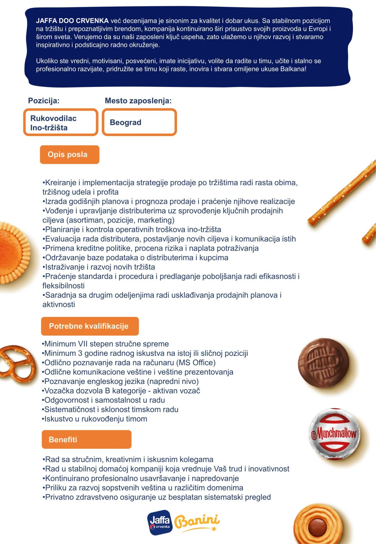 Mi smo kompanija Jaffa - jedan od najvećih proizvođača slatkiša i grickalica na Balkanu. Već dugi niz godina predstavljamo sinonim kvaliteta i dobrog ukusa. Sa višedecenijski utemeljenim kvalitetom proizvodnje, stabilnom tržišnom pozicijom i prepoznatljivim brendom, osvajamo nove prostore…