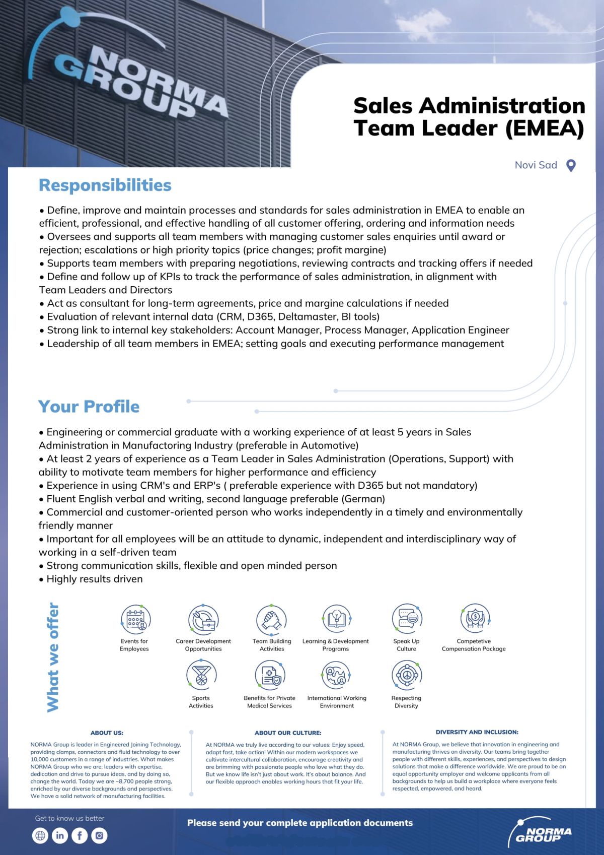 NORMA Grupa je lider na svetskom tržištu u oblasti Tehnologije konstruisanih spona i spojnica. Nudi više od 35.000 proizvoda visokog kvaliteta i rešenja za gotovo 10.000 aktivnih korisnika širom sveta. Kompanija proizvodi i prodaje široku paletu inovativnih rešenja u kategorijama spona, spojnica i fluid programa za različite klijente u više od 80 zemalja. NORMA Srbija razvija i proizvodi najinovativnije, na plastici zasnovane, komponente i sisteme iz oblasti Tehnologija spajanja za automobilsku…