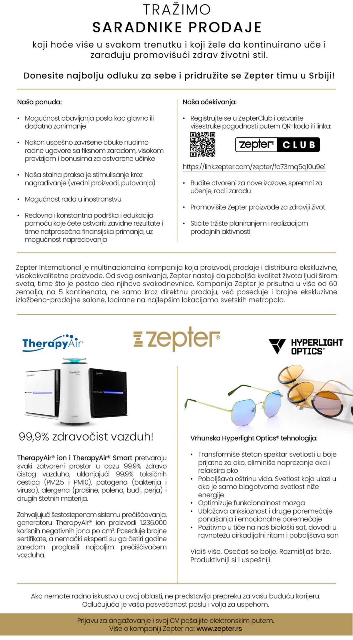 Zepter International je multinacionalna kompanija posvećena stvaranju zdravijeg, kvalitetnijeg i dužeg života za ljude širom sveta. Kroz razvoj, proizvodnju i distribuciju ekskluzivnih, visokokvalitetnih proizvoda, Zepter svakodnevno unapređuje živote miliona korisnika, promovišući zdrav način života i vrhunske standarde kvaliteta. Sa poslovanjem u više od 60 zemalja na pet kontinenata, kompanija raspolaže sa 8 savremenih fabrika u Nemačkoj, Italiji i Švajcarskoj i više od 320.000 m² poslovnog…